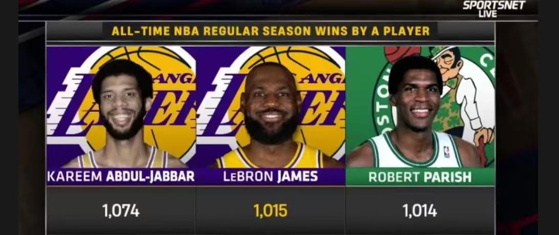 本场胜利后,勒布朗(骑士、热火、湖人)也以1015场生涯胜利超越八十年代凯尔特人冠军中锋“酋长”罗伯特·帕里什(勇士、凯尔特人、黄蜂、公牛1014场),距离第一名的“天勾”贾巴尔还有59场。