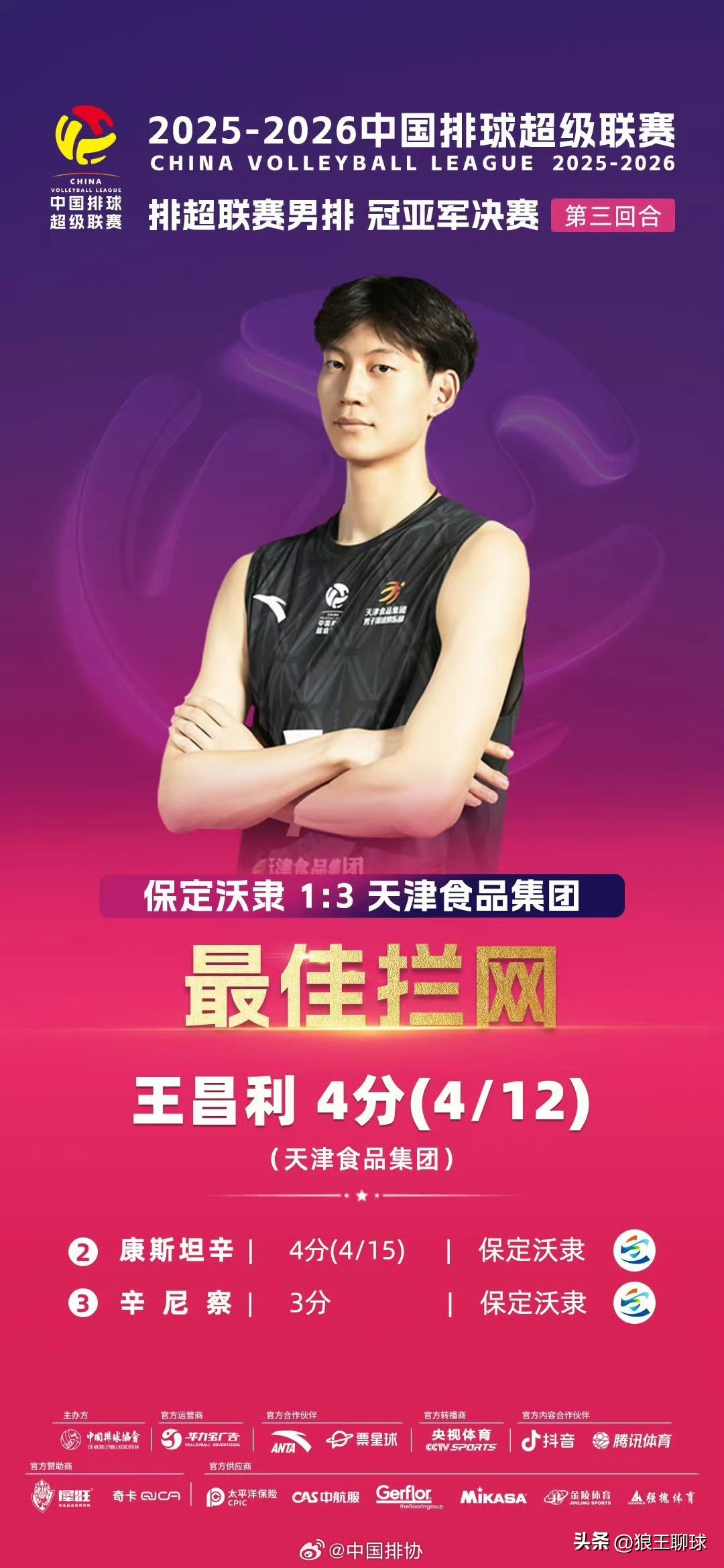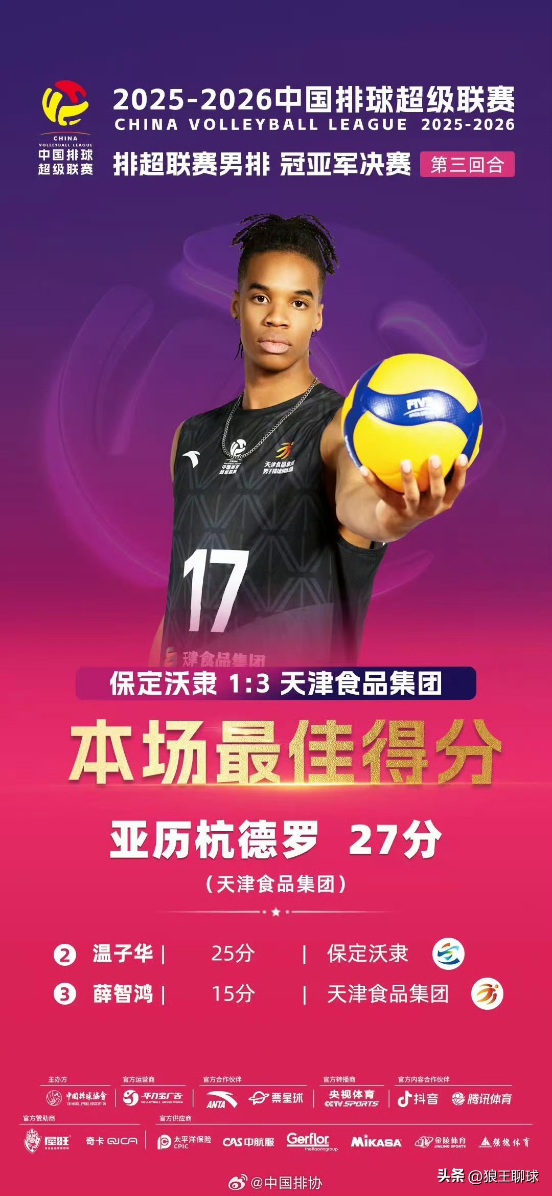 2025-2026中国男排超级联赛冠亚军决赛第三回合,保定沃隶主场1比3负于天津食品集团(25-16、22-25、21-25、23-25)。天津食品集团总比分2比1获得本赛季男排超级联赛冠军!
