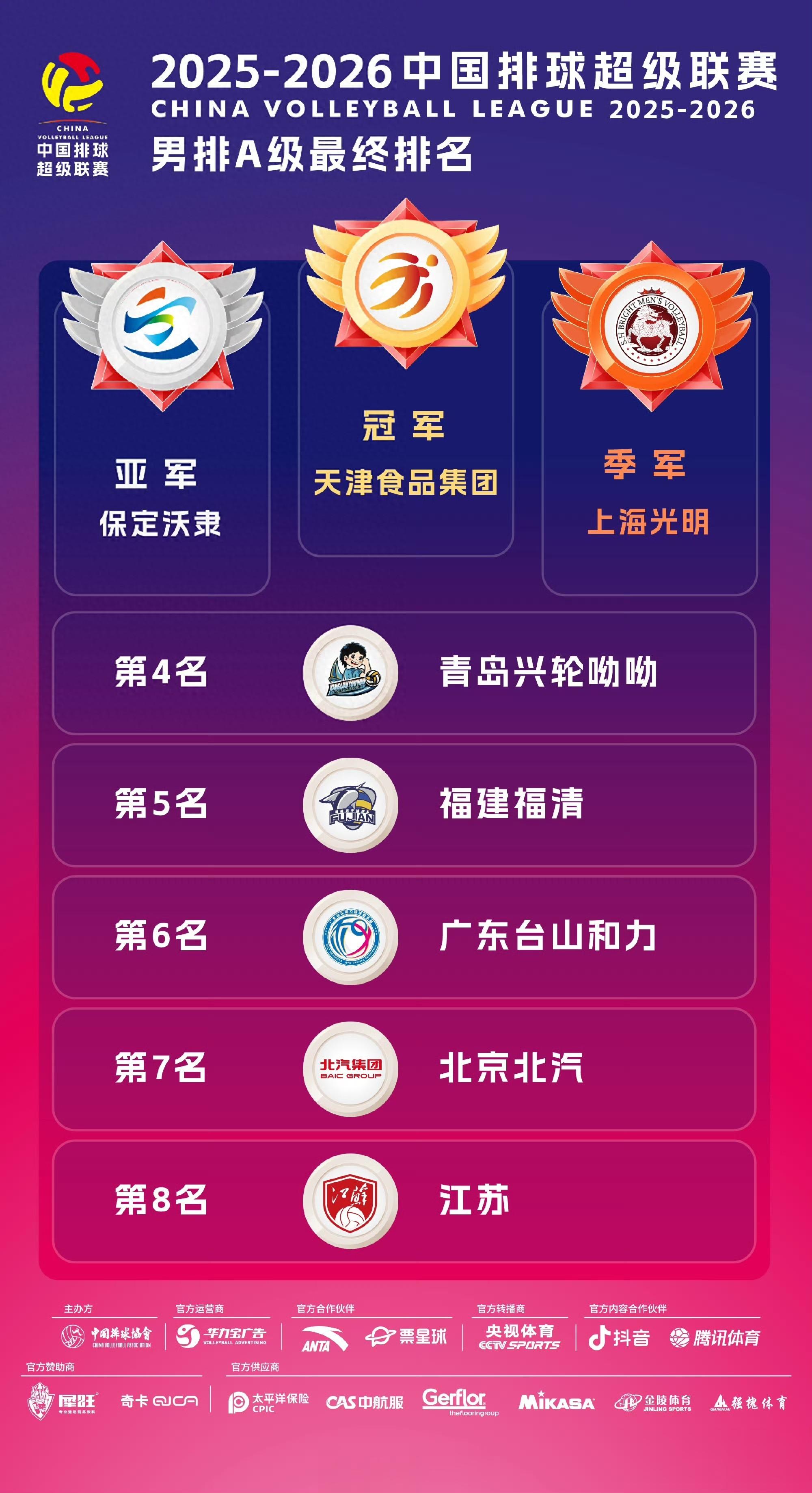 2026年4月5日晚,2025-2026赛季中国男子排球超级联赛落下帷幕。天津食品集团、保定沃隶、上海光明分别获得冠军、亚军、季军。