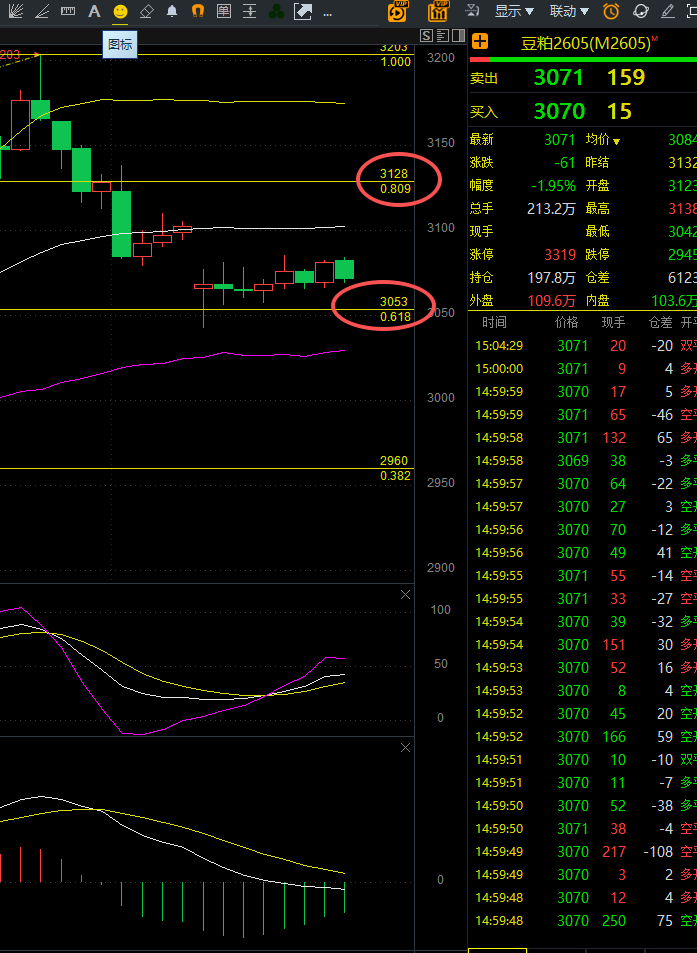 日线级别:回调跌破前期震荡区间,价格跌破多条均线,均线多头排列被打破,回调动能强劲,出现明确单边回调信号,豆粕2605合约收盘3084元/吨,跌1.95%。
