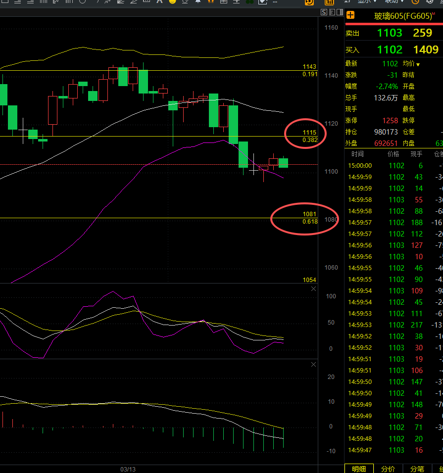 短线级别:玻璃三十分钟死叉形成,KDJ进入弱势区间,空头能量逐步释放,回调力度加大。
