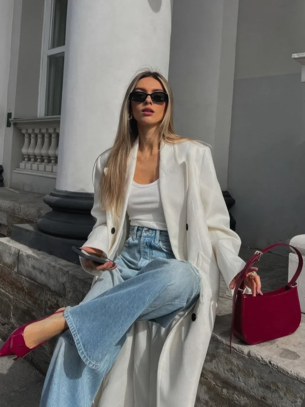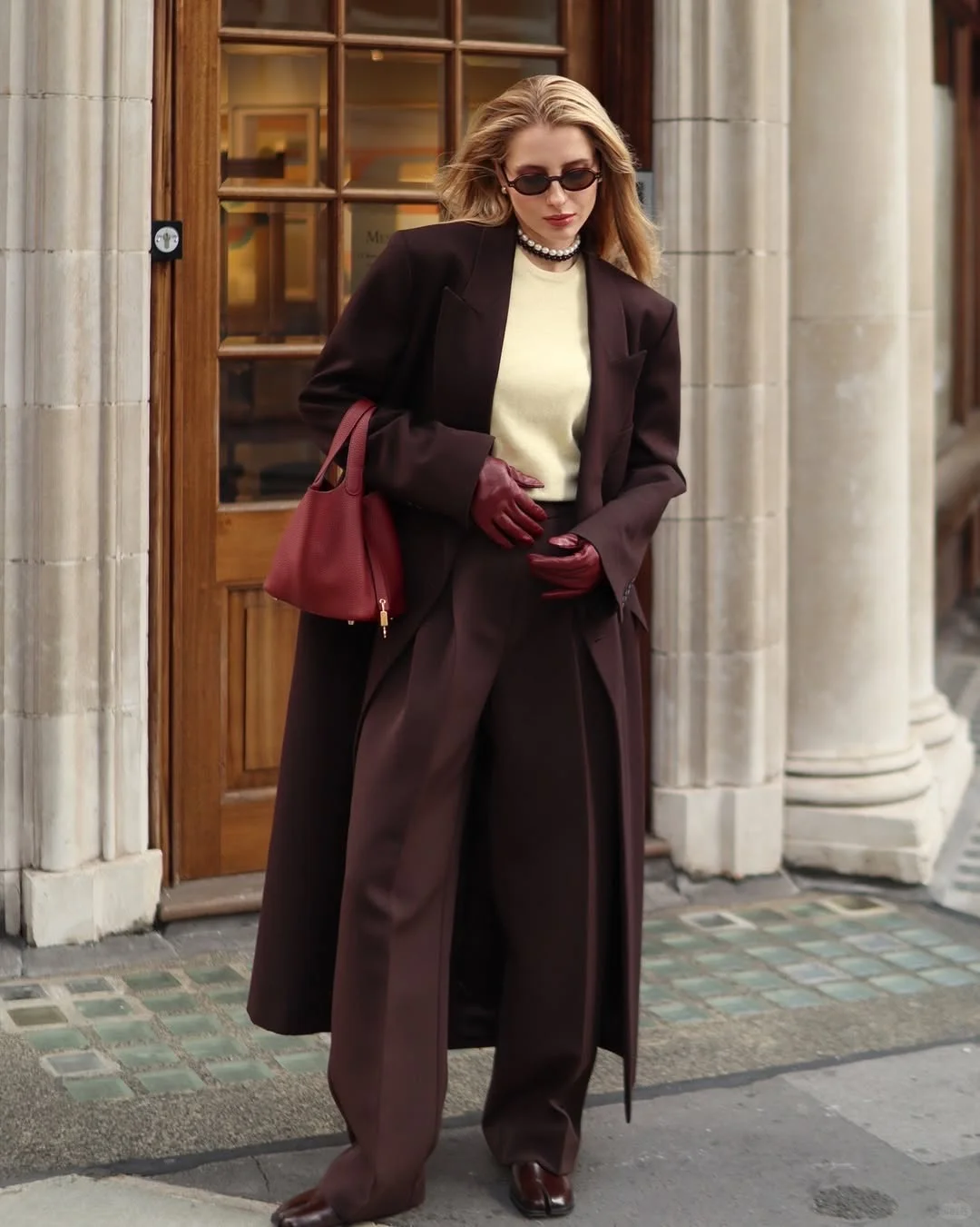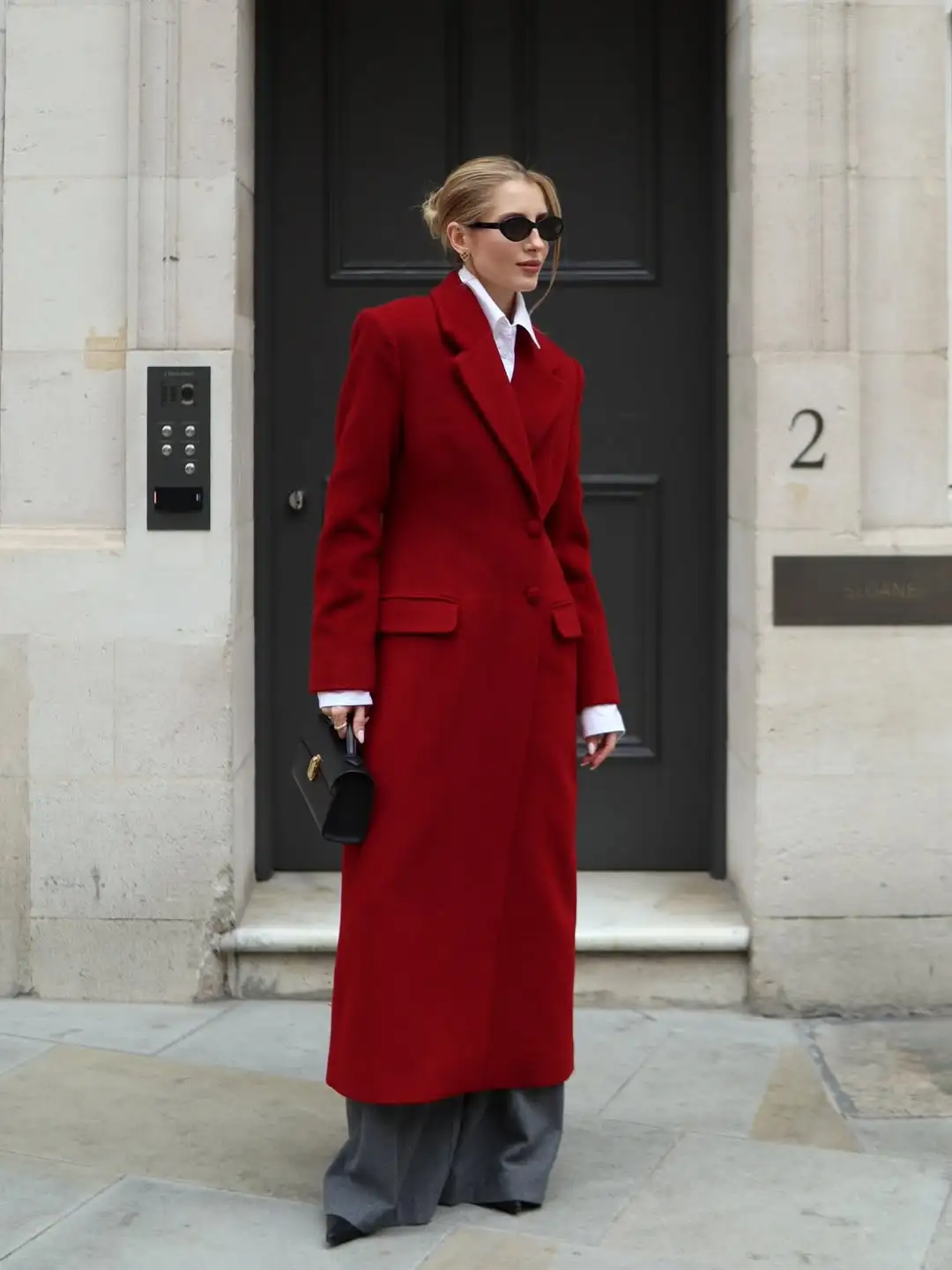 正红色大衣不是节日专属的艳色,既可以是通勤时的气场铠甲,也可以是约会时的浪漫战袍,白衬衫的领口露出半片,像给浓烈的红添了一笔留白;灰色阔腿裤垂感十足,平衡了大衣的明艳。