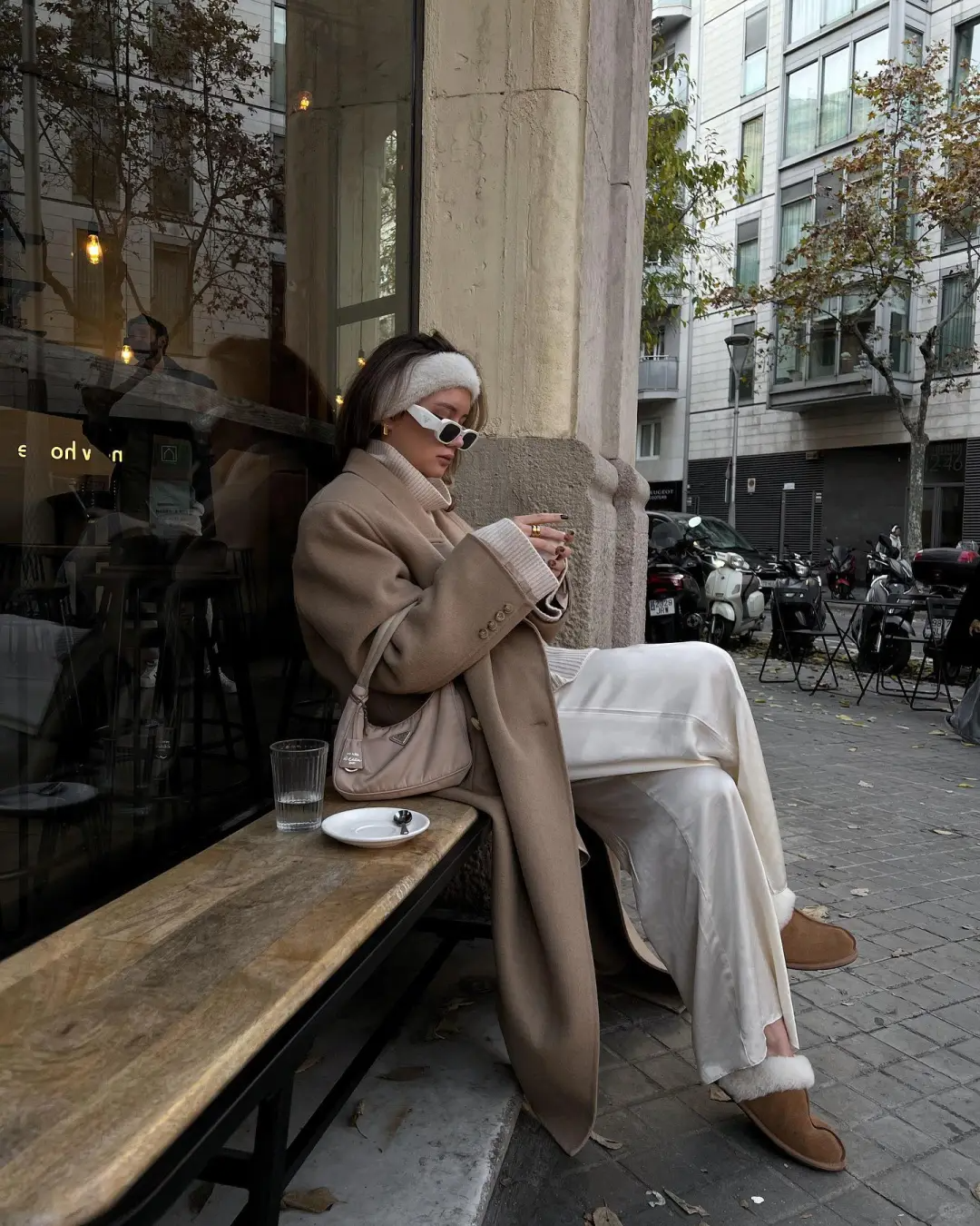 运动套装的随性打破了驼色大衣的 “正式感”,白鞋的活力让整体在 “慵懒” 与 “自在” 之间自由切换。白色阔腿裤的垂感与大衣的柔软连成一片,UGG 把秋冬的温暖踩在脚下。