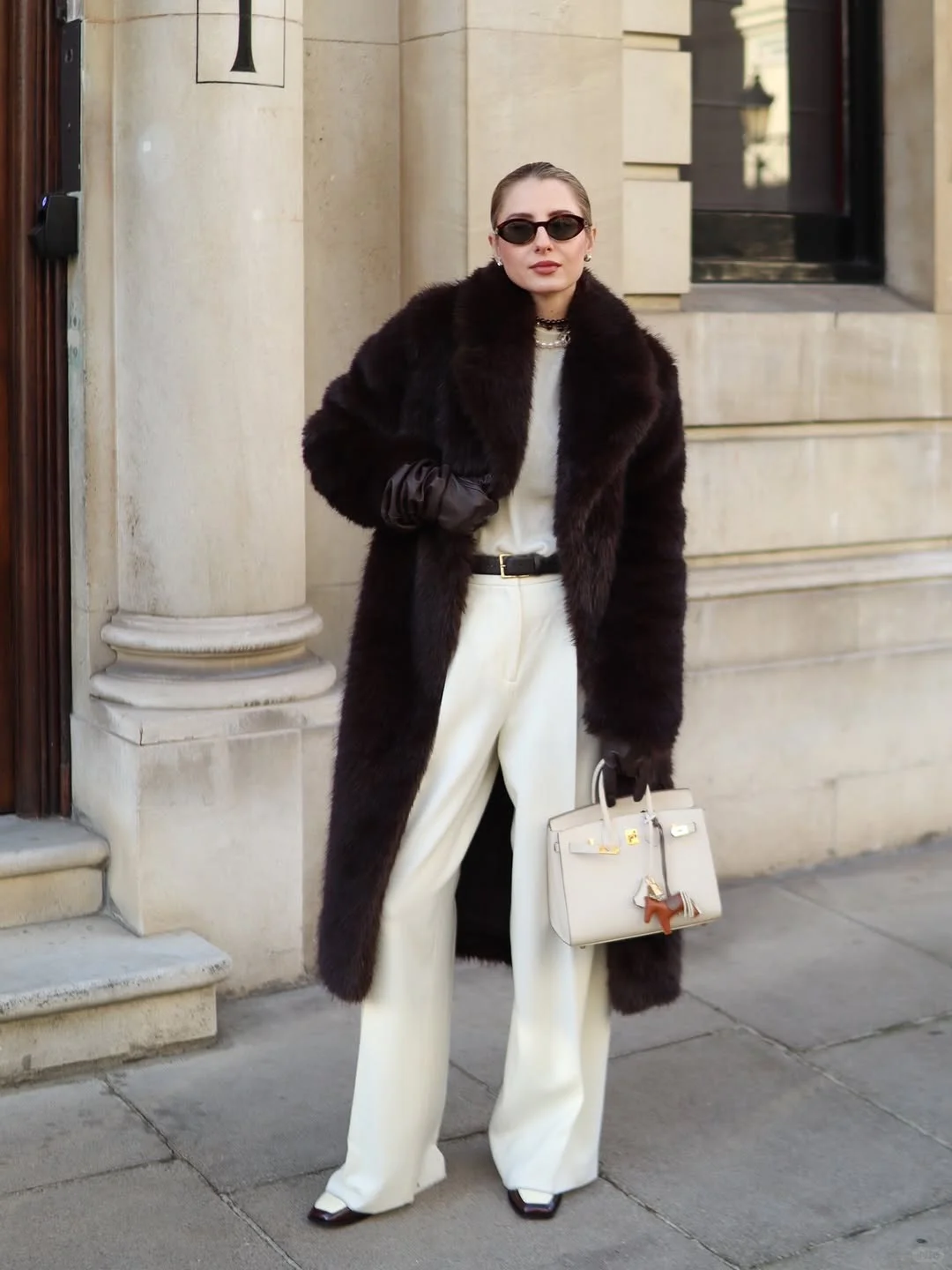 参考上一套搭配思路,将羊绒大衣换成毛绒皮草大衣,也很突显气场,超适合高个姐妹。记得拎一个和大衣\裤子同色的包包。