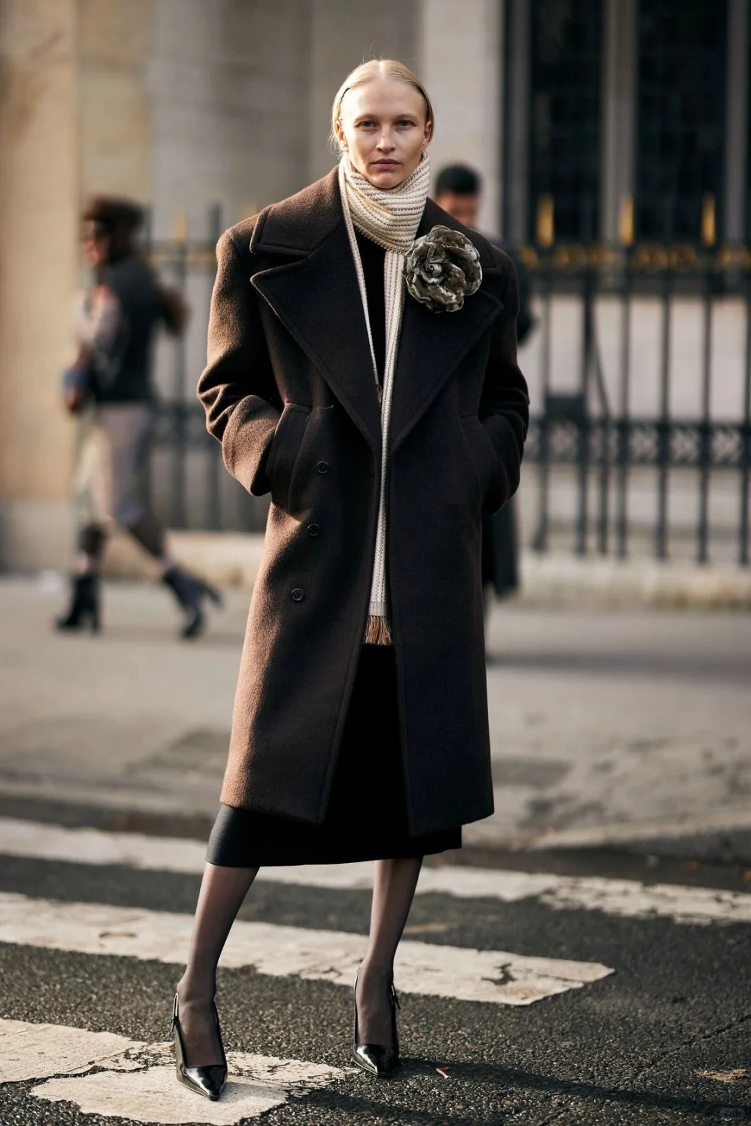 黑色裙子贴合身形,与咖色大衣碰撞,裙摆与大衣下摆的垂坠感相互呼应,行走间自带优雅韵律。