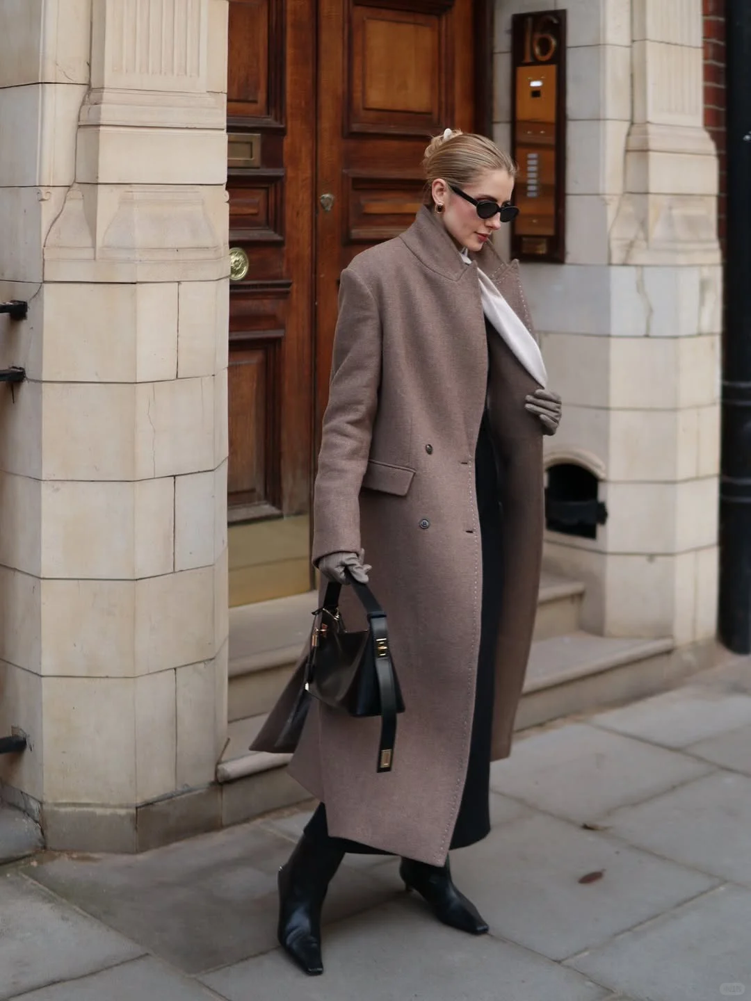 黑色大衣可以用白衬衫与腰带,画出职场的气场;可以用黑高领与 UGG,画出街头的松弛;可以用米白毛衣与尖头鞋,画出法式的优雅;也可以用黑丝与长靴,画出酷飒的甜辣。