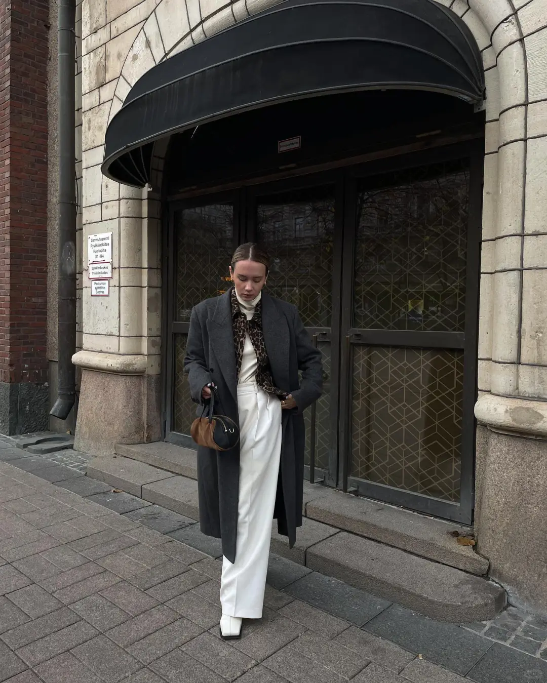 深灰大衣的硬挺廓形与白裤的垂感连成一片,豹纹丝巾是冷调里的点睛之笔,墨镜与 mini 手拎包的点缀让优雅里多了一份清冷的氛围感。