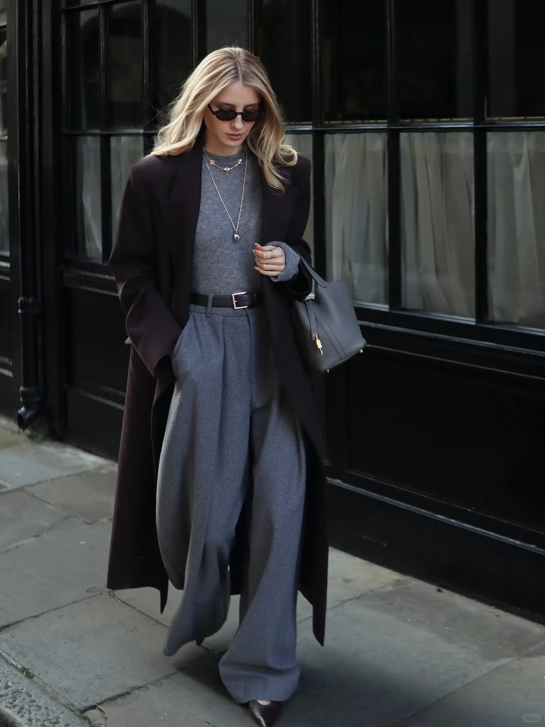 浅灰大衣的柔软质感与深棕裤装的硬朗撞出奇妙平衡,露在毛衣下摆的白内搭像给冷调灰添了一笔温柔留白。