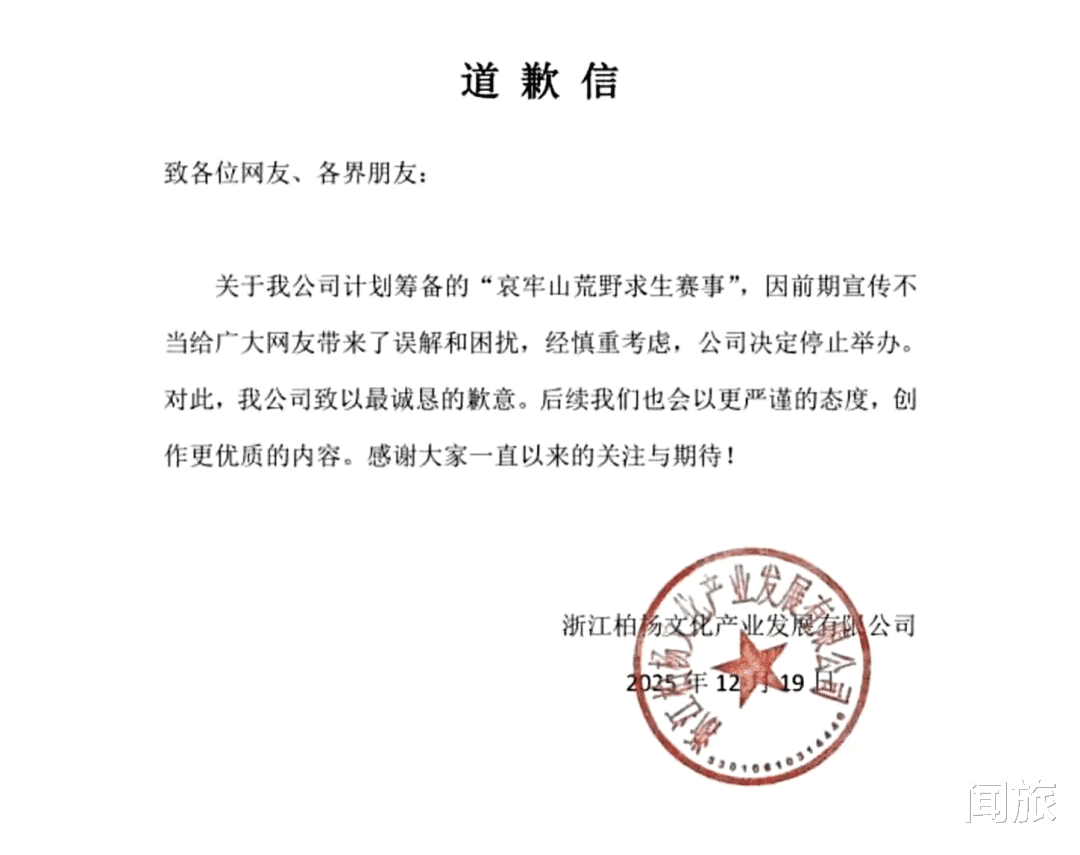 12月19日,一家名为浙江柏杨文化产业发展有限公司的企业发布了一封道歉信,宣布停止举办计划中的“哀牢山荒野求生赛事”,给出的理由是“前期宣传不当”。
