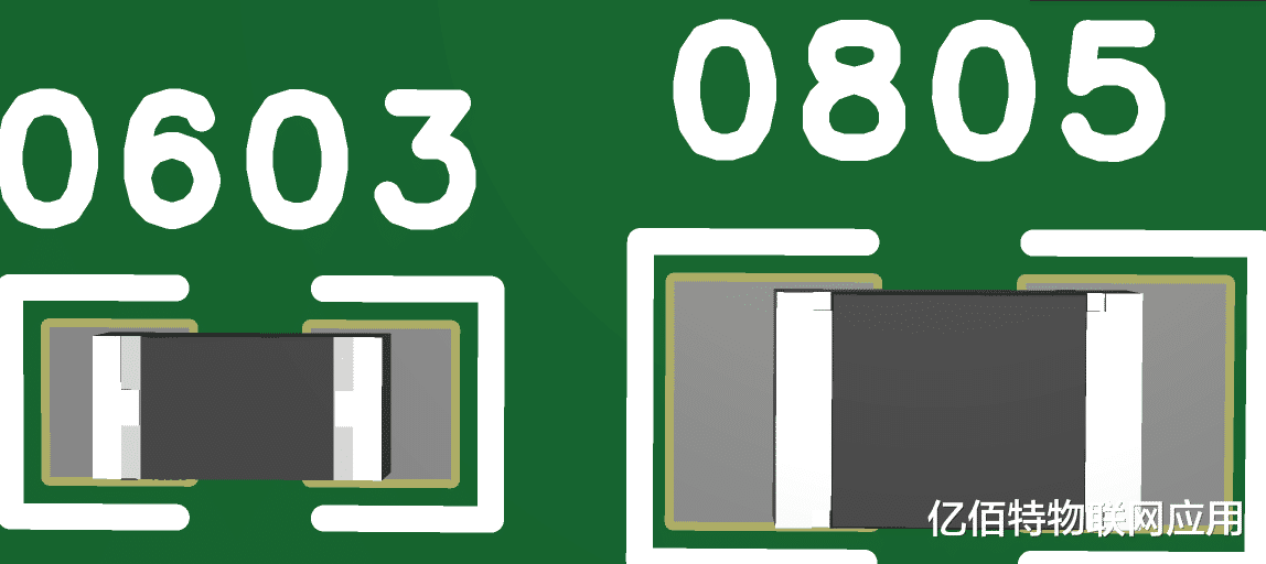 2.3D 视图强制核对:调用封装库后必须切换至 3D 视图检查,重点核对焊盘间距、元件高度是否符合结构设计要求。下图是0603与0805电阻的3D封装对比,可见两者的焊盘间距差异明显: