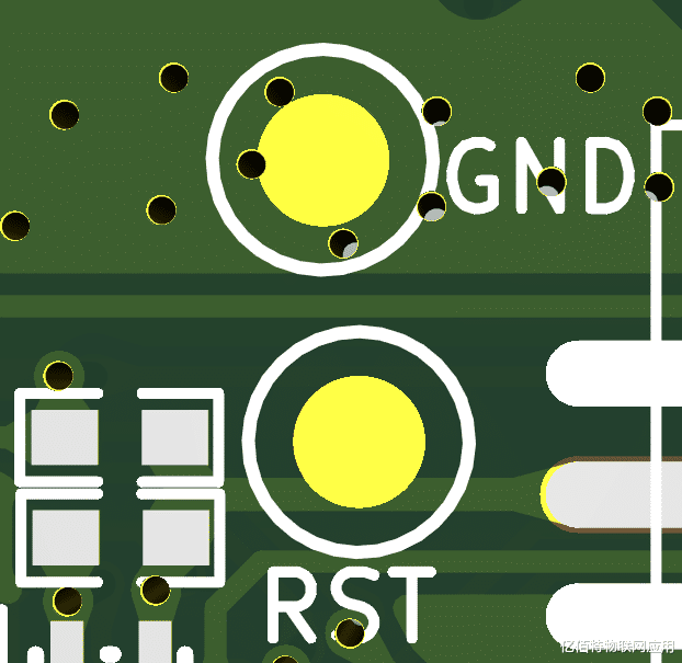 1.测试点标准化设计:关键信号(时钟线、复位线、电源轨)旁预留直径≥0.8mm的测试点,旁边写上丝印方便调试时快速定位,下图是单片机复位线和地的测试点: