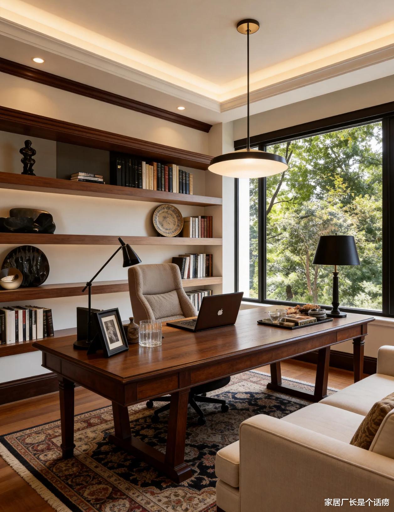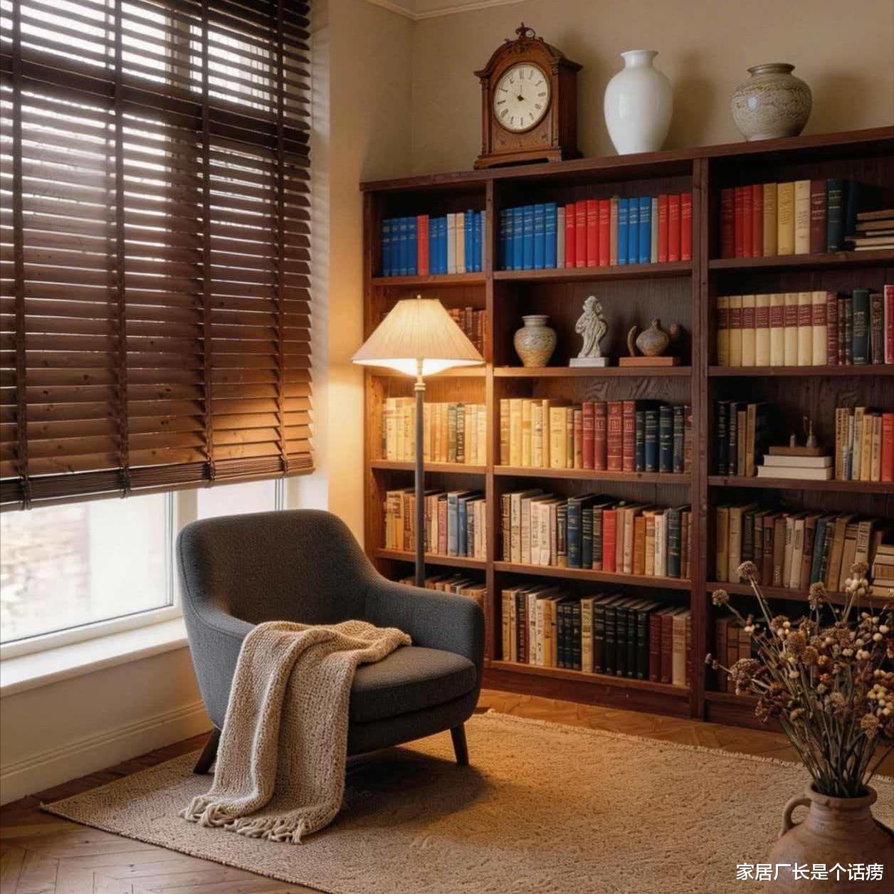 你看这张书房图,弧形实木书柜沿着墙角延伸,没有尖锐的棱角,既利用了死角,又让空间变得柔和,摆上几个陶罐、几本书,阳光一照,优雅十足,这不比网红款的“性冷淡风”更让人想待着?