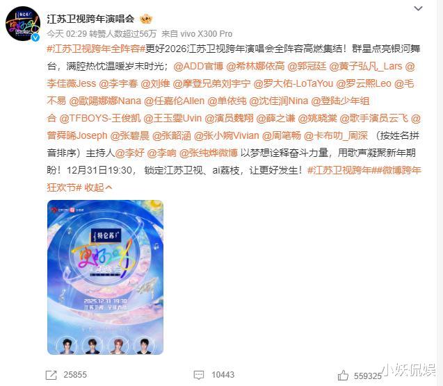 金牌主持天团坐镇:稳控全场,解锁跨年仪式感江苏卫视跨年的“安心感”,从李好、李响、张纯烨的主持组合亮相就开始了。这三位陪伴观众多年的金牌主持人,早已凭借默契配合与专业控场,成为江苏卫视跨年的“标志性符号”。李好的稳健大气、李响的沉稳细腻、张纯烨的灵动活泼,三种风格完美互补,既能稳稳接住零点报时的庄重时刻,也能轻松hold住嘉宾互动的轻松环节。