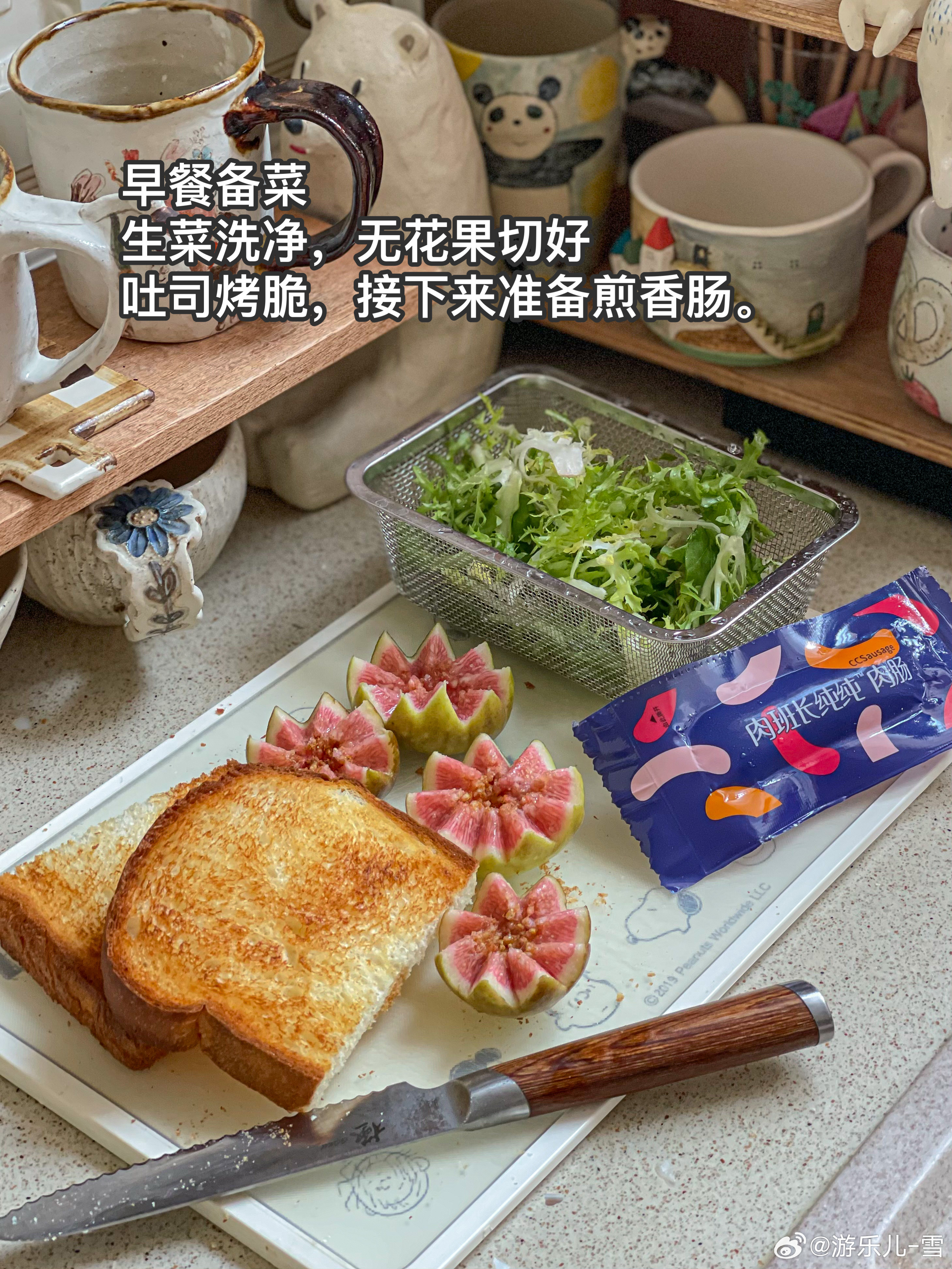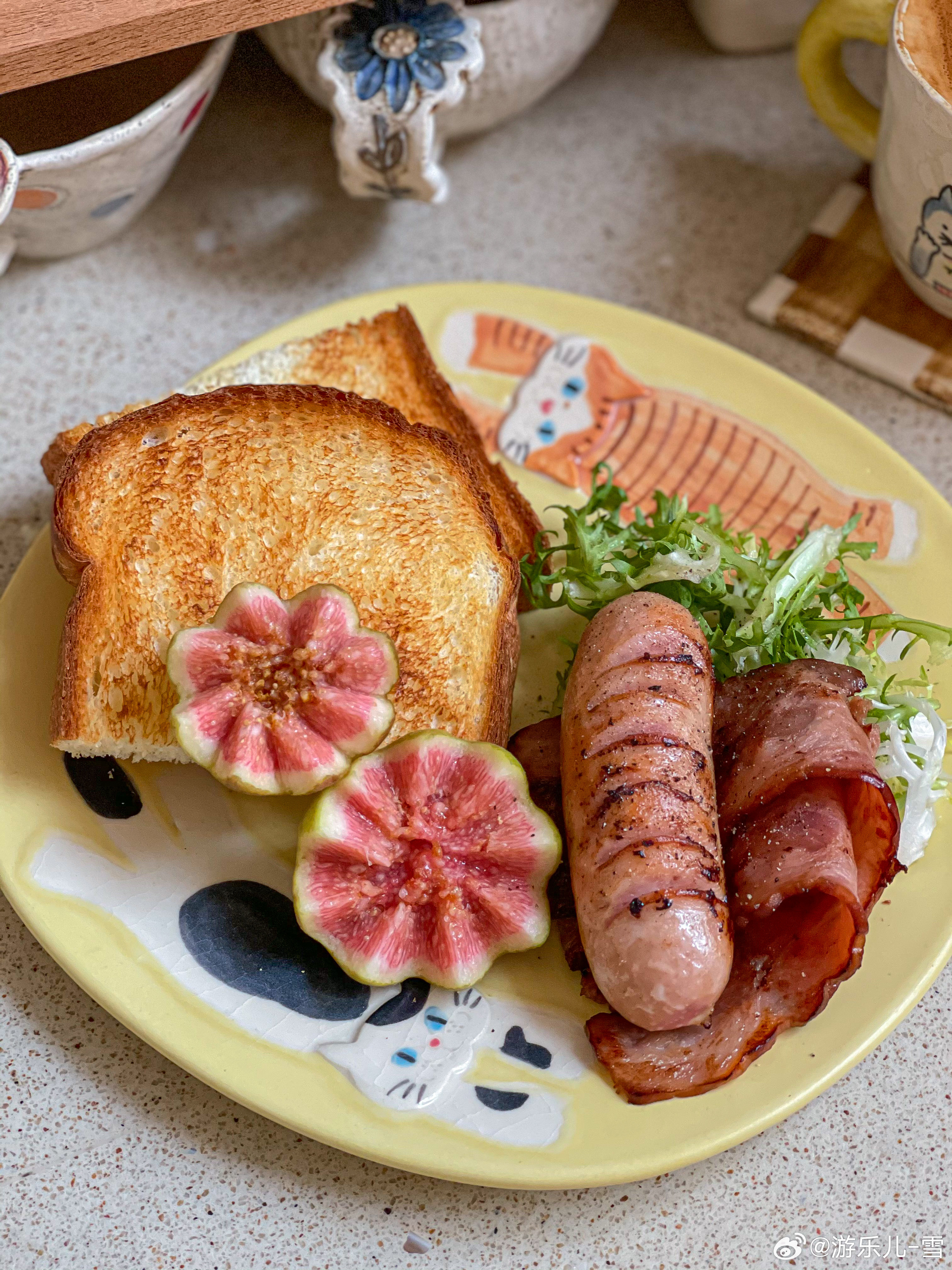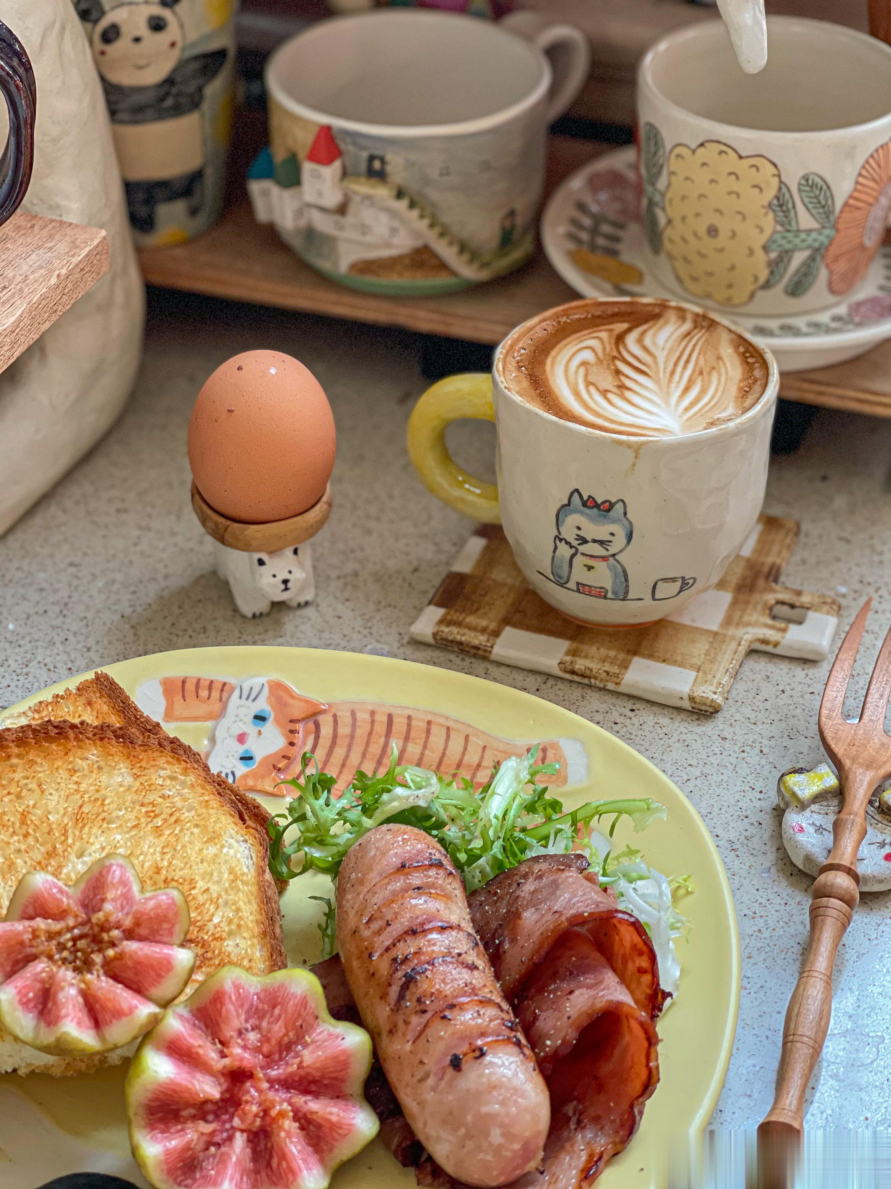 周三早餐:蜂蜜吐司+煎肠+煎培根+无花果+拿铁[微风][微风]又是元气满满的一天