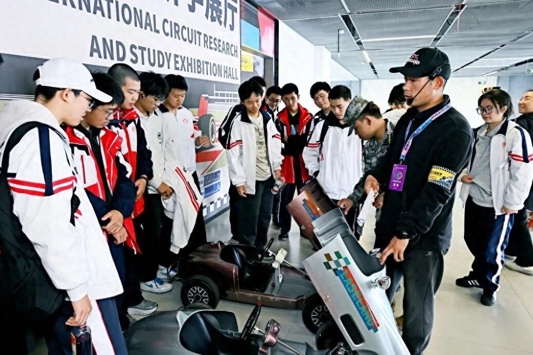 这不是一次走马观花的参观,而是一次“硬核”科技探秘。在天府国际赛道,学生们不再是观众席上的看客,而是走进了赛事科普展厅、颁奖台、指挥中心、媒体中心等核心区域。宣讲导师从赛道设计的国际标准,讲到赛事运作全流程,再到赛车构造原理和汽车运动文化,把顶级赛事场景变成了“行走的课堂”。