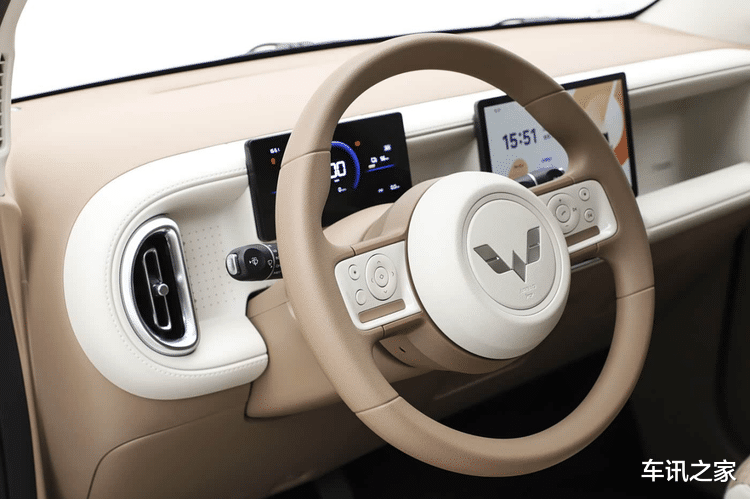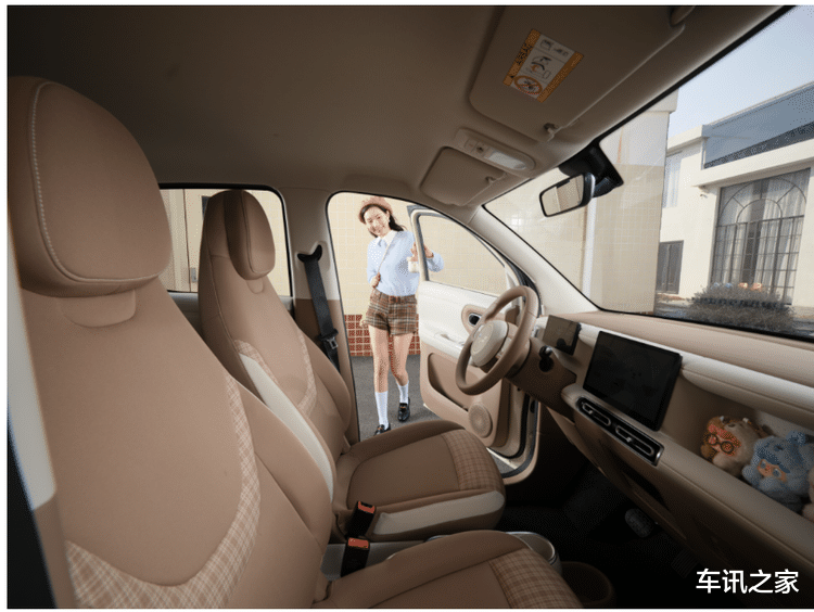 同样,这份高级感还持续到了车内。拉开车门,第五代宏光MINIEV的焦糖奶油内饰充满松弛感,而环行线条的修饰则让整个座舱更有“温度”。另外,新车还在副驾前方设计了“百变造景空间”,无论是储物还是用手办进行装饰都很合适。
