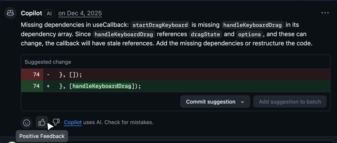 在幕后,我们持续进行实验以提升评论质量。同时,我们也迁移到了基于智能体的架构,能够检索代码仓库上下文并对变更进行推理。在整个过程中,我们始终倾听你的反馈:无论是问卷调查,还是你对评论简单的点赞或点踩,都帮助我们识别关键问题,并不断优化用户体验,从而提供更全面的审查体验。