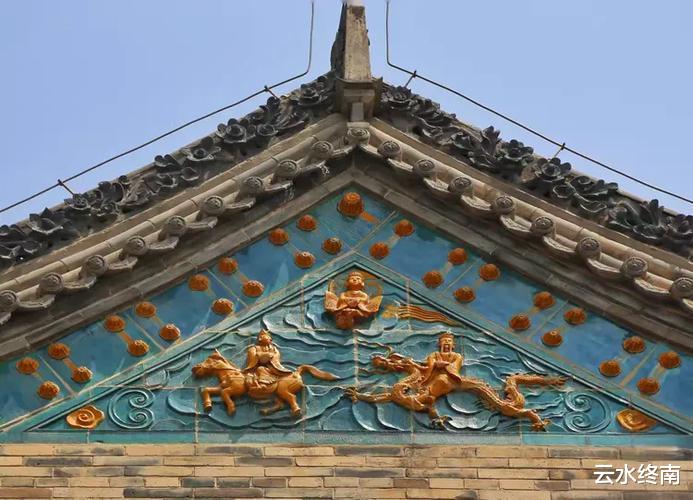从台阶上能看到台上建筑山墙上山花的琉璃浮雕人物,有骑龙的又骑凤的有骑马的。以前我没有在山花看到过人物浮雕,这是头一次,大惊小怪了。