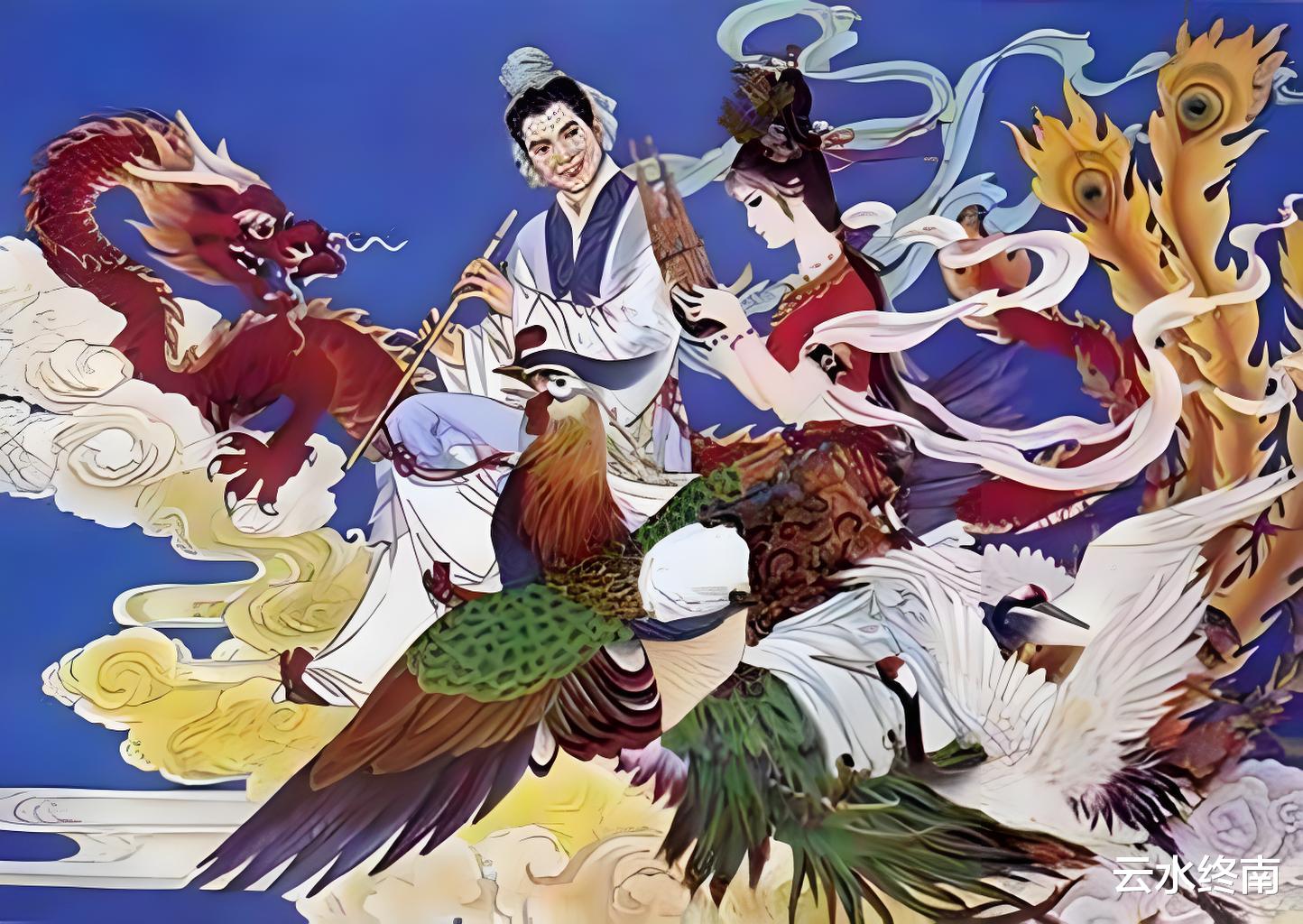 小夫妻俩在台上合奏的乐声美轮美奂,引来一龙一凤,龙凤呈祥。于是萧史乘龙,弄玉乘凤,双双飞入云霄,腾空成仙。