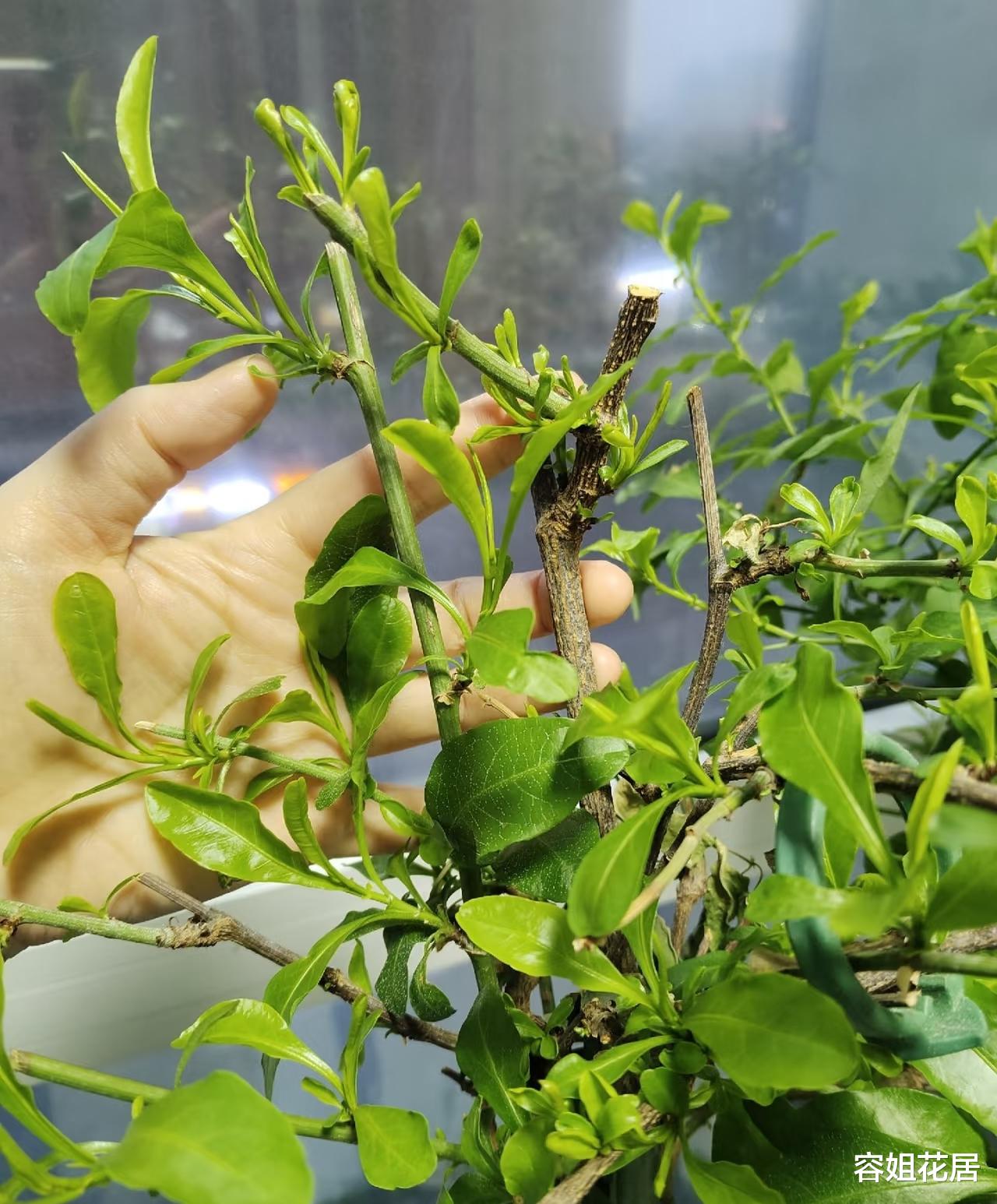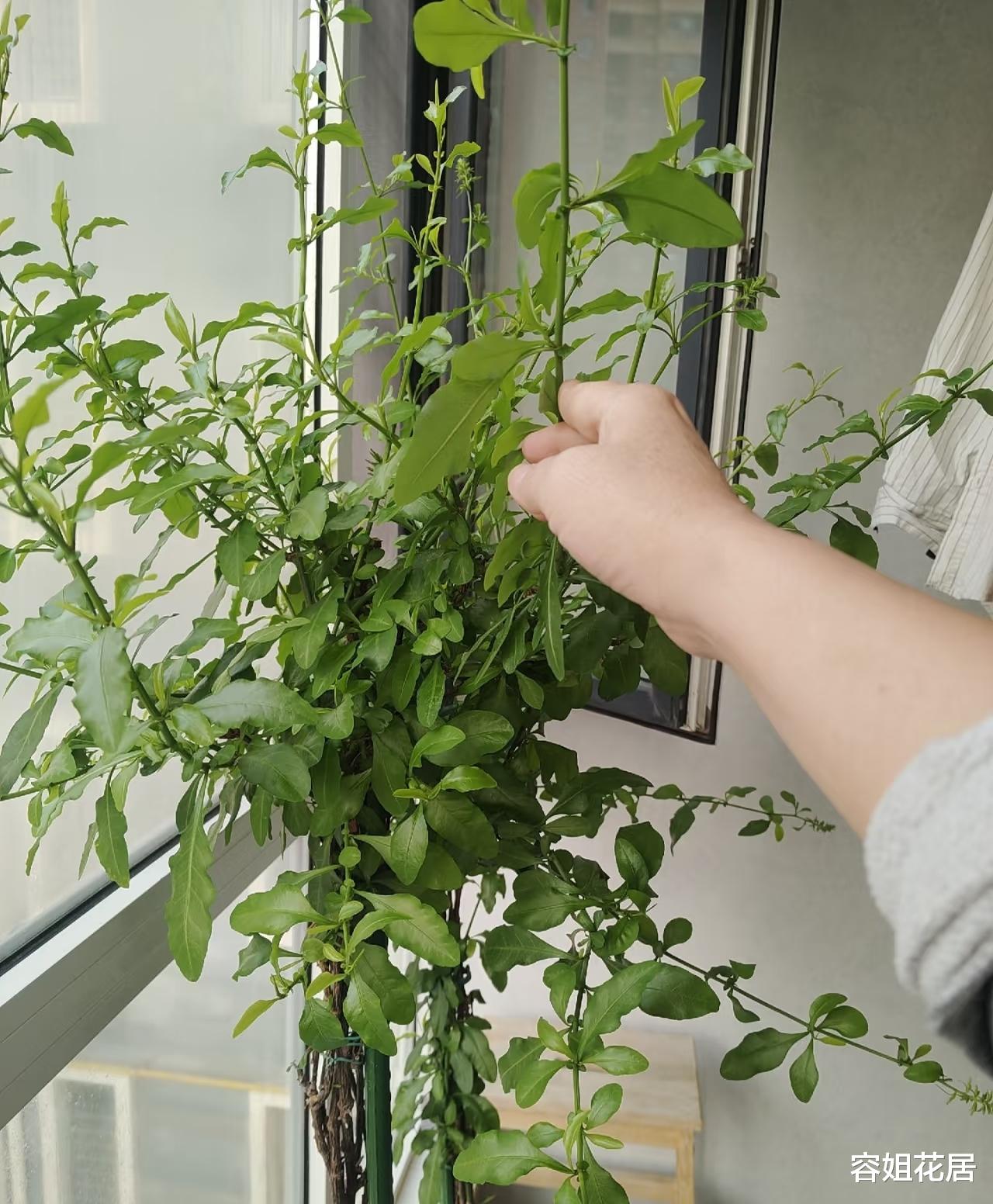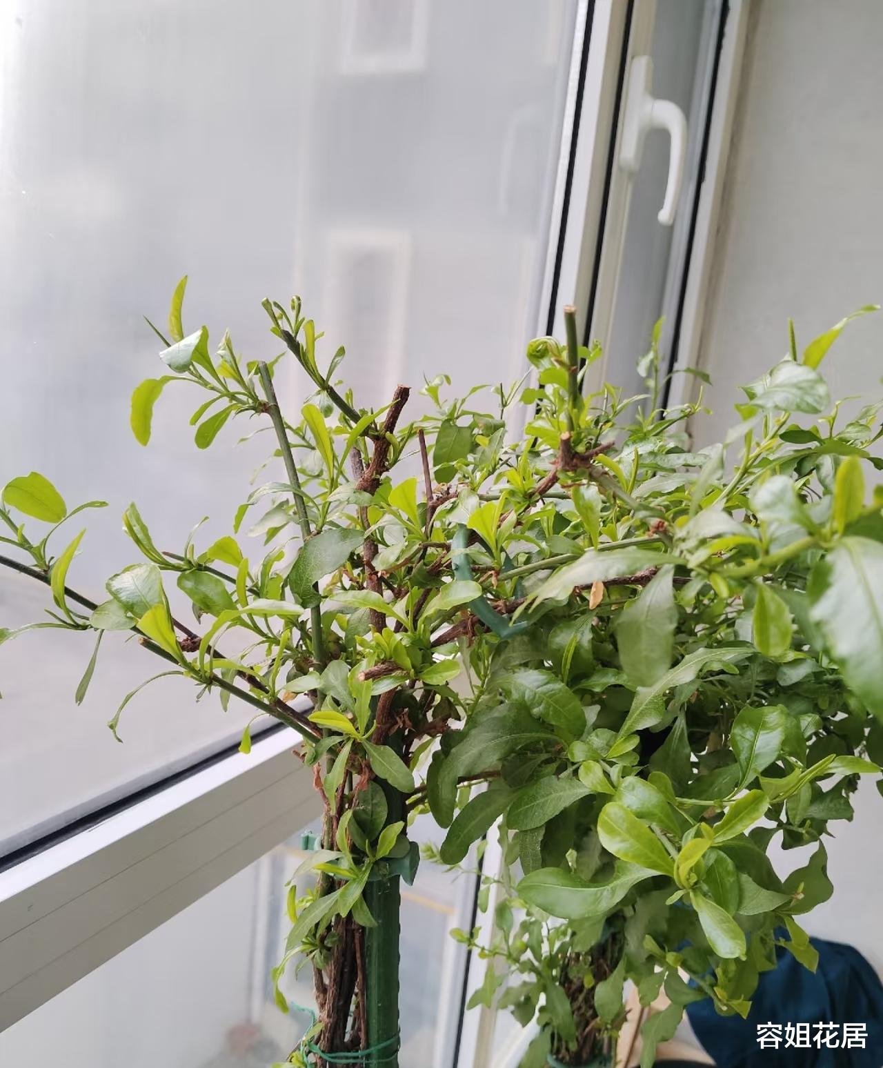 另外还要用竹竿固定,防止主干太细倒伏。等到高度长到1.5米左右,再把上面的顶芽全部剪掉,让它长出更多的侧芽,侧枝越多开花越多。