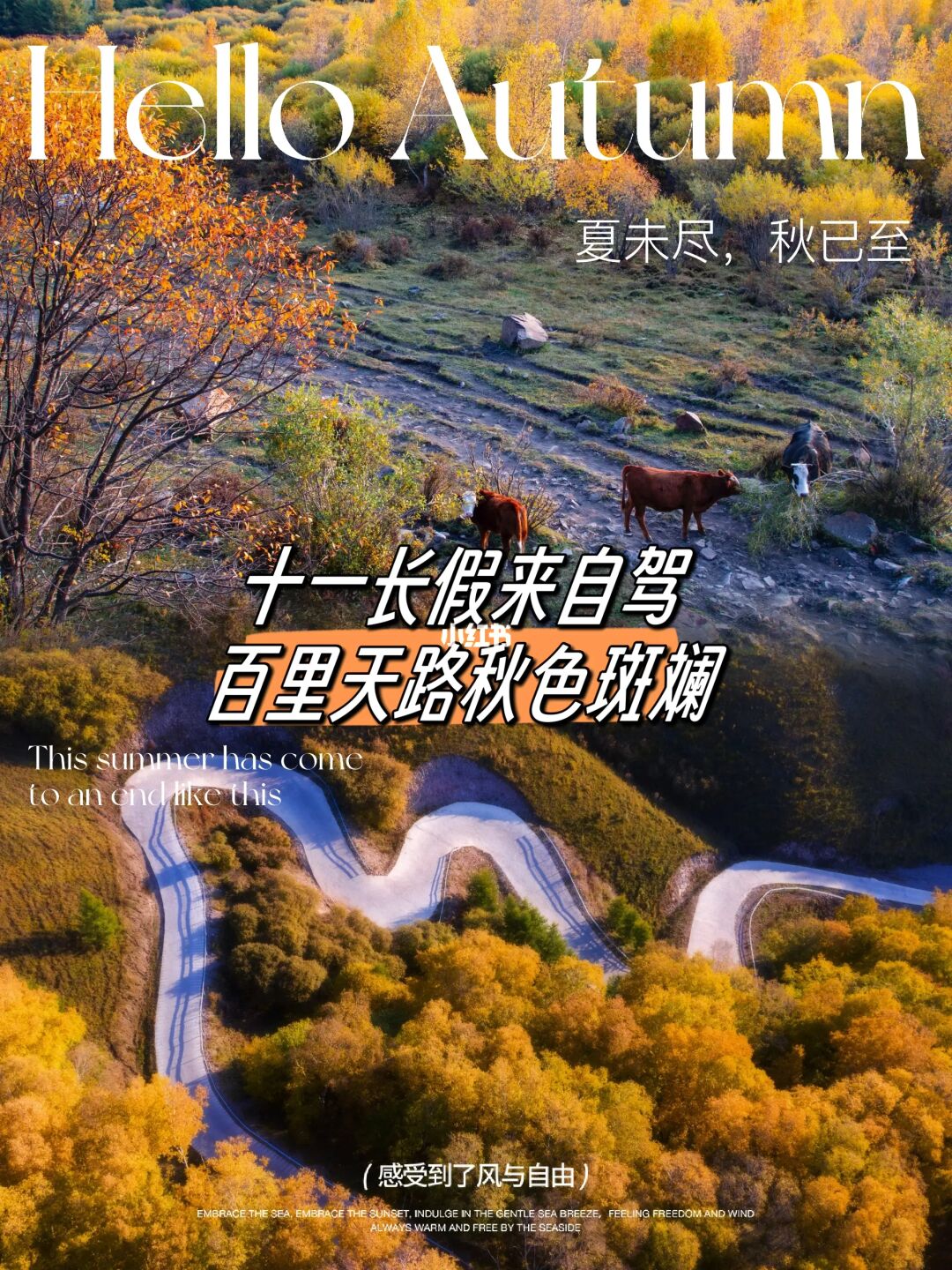 百里天路秋景最佳观赏期9.15-10.7,是一年中色彩最丰富的时刻。正好横跨中秋十一假期,而且草原辽阔,不必担心热门景区的人潮汹涌,可以尽情拥抱天地的辽阔。