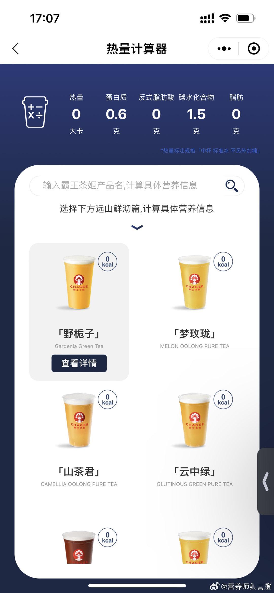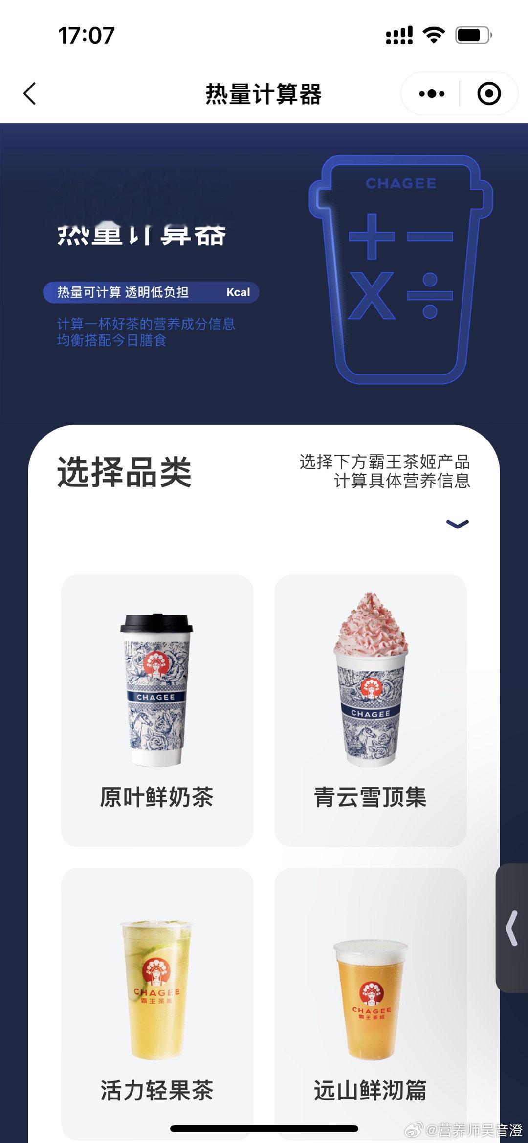 目前在小程序热量计算器进入,可以看到四个品类的奶茶热量等身份信息,分别是原叶鲜奶茶系列、青云雪顶集系列、活力轻果茶系列、远山鲜沏篇系列,要喝的赶快啦!