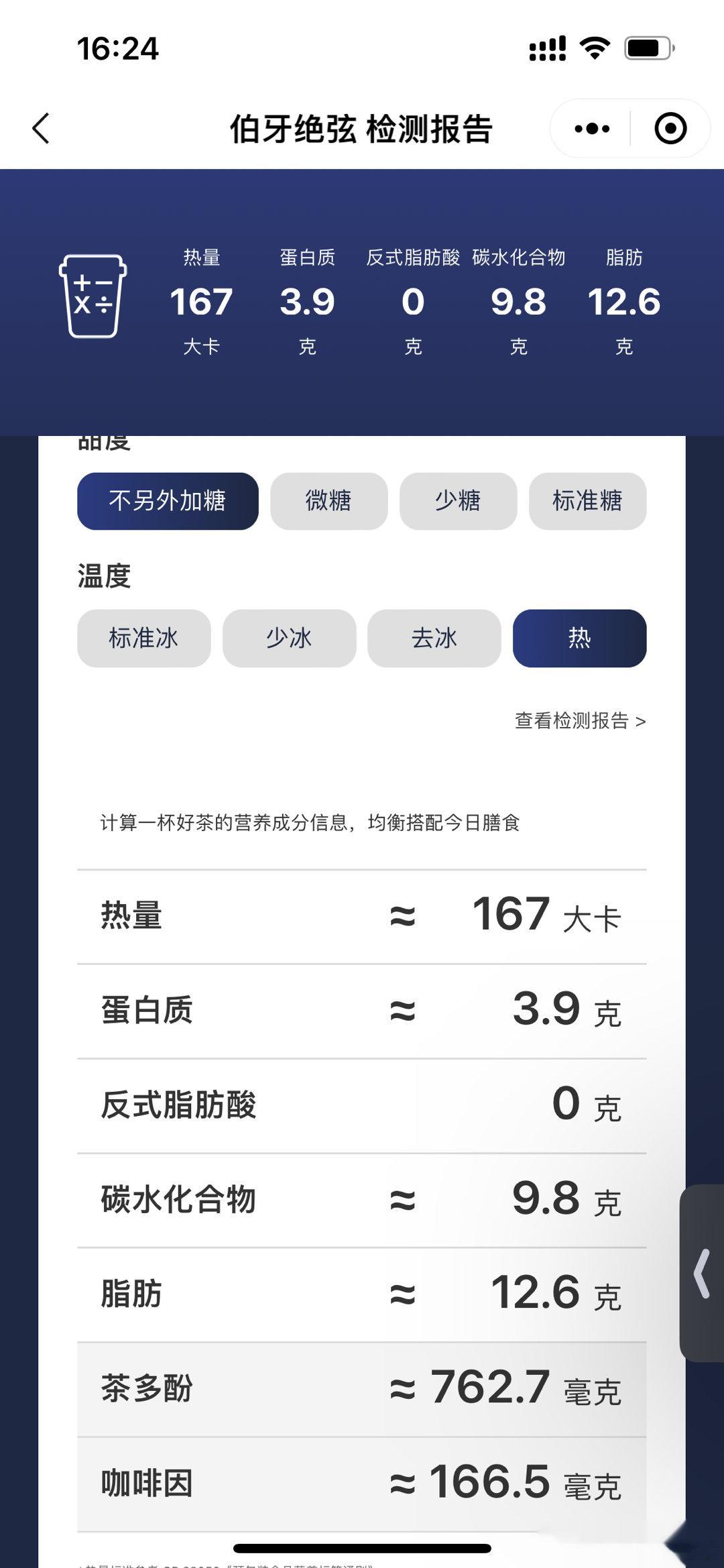 就比如我喜欢的伯牙绝弦,小程序点单,选择大杯、不另外加糖、热,就自动出现热量167kcal等信息!喝了这一杯,我就可以知道去如何更好搭配日常饮食了!这对于买东西必看食物成分表的营养师的我来说,不得不点个赞👍👍👍