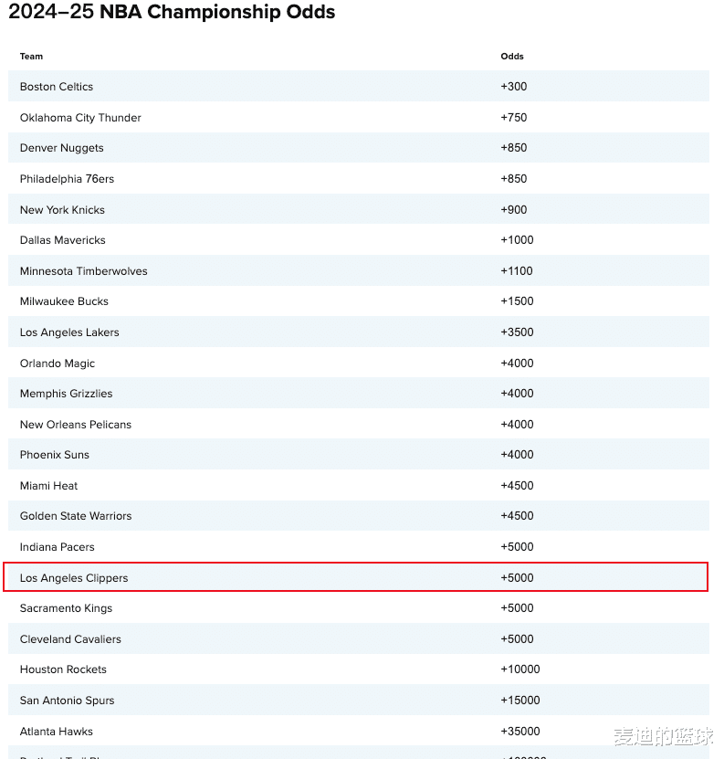 可是自19-20赛季以来,伦纳德带领球队在季后赛中狂输了31场季后赛,最好的一次成绩便是快船的第一个赛季,和掘金打到了第二轮抢七大战被淘汰。此后的几年,快船队的成绩一年不如一年,球队为了能够夺冠,每年都在围绕伦纳德进行补强,可是收效甚微,伦纳德在过去的5年里狂输了31场季后赛的同时,季后赛的胜率仅为33.3%。在伦纳德加盟快船的首个赛季,快船队当年的夺冠赔率高居联盟第二,仅次于湖人队,可如今湖人队早就完成了一个总冠军和一次西部决赛。