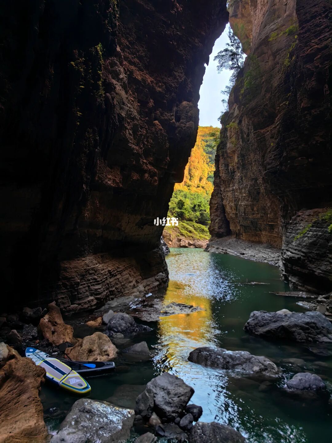 这周末去了重庆178小环线,在湖水的尽头竟然暗藏了一个峡谷 需要桨板划进去,把桨板靠在峡谷入口即可。 峡谷水很清,可以一路溯溪而上,有几个比较大的水池可以游泳,水很凉,特别清,里面还有小鱼。 建议还是把头盔带上,有可能会有落石