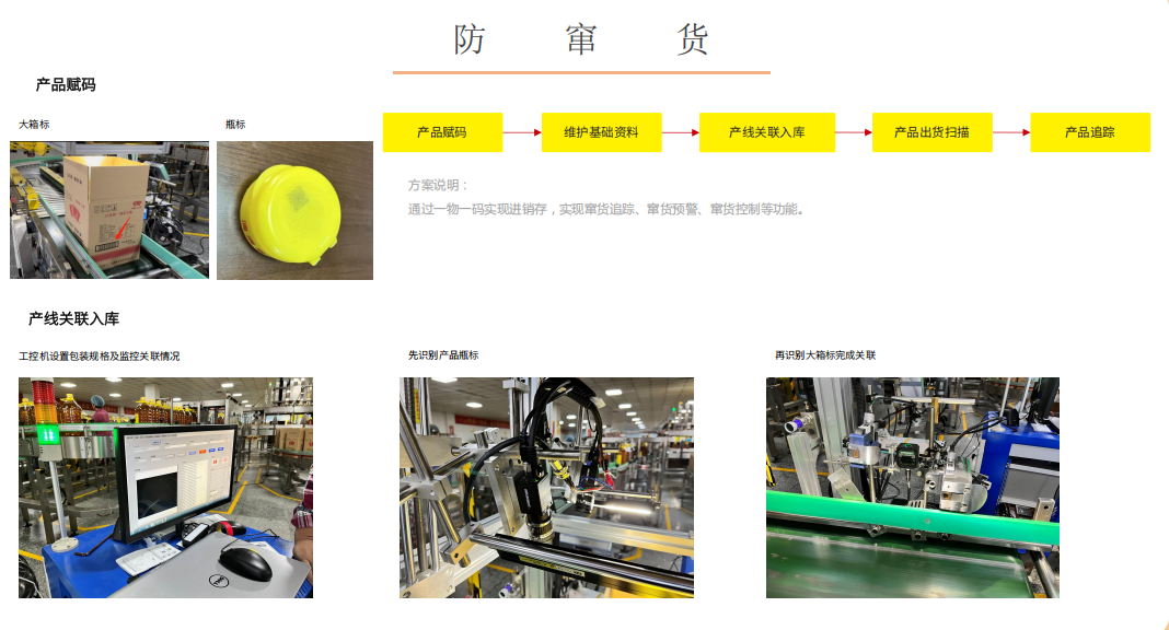 防伪防窜货监管功能:市场督导人员可通过扫描瓶码、箱码,查询到该产品的相关发货信息,及时发现窜货问题。系统还通过可疑码查询、定位,防伪扫码预警等实现防伪功能,并提供数据报表,直观显示窜货预警信息,提醒监管人员该产品出现窜货现象。