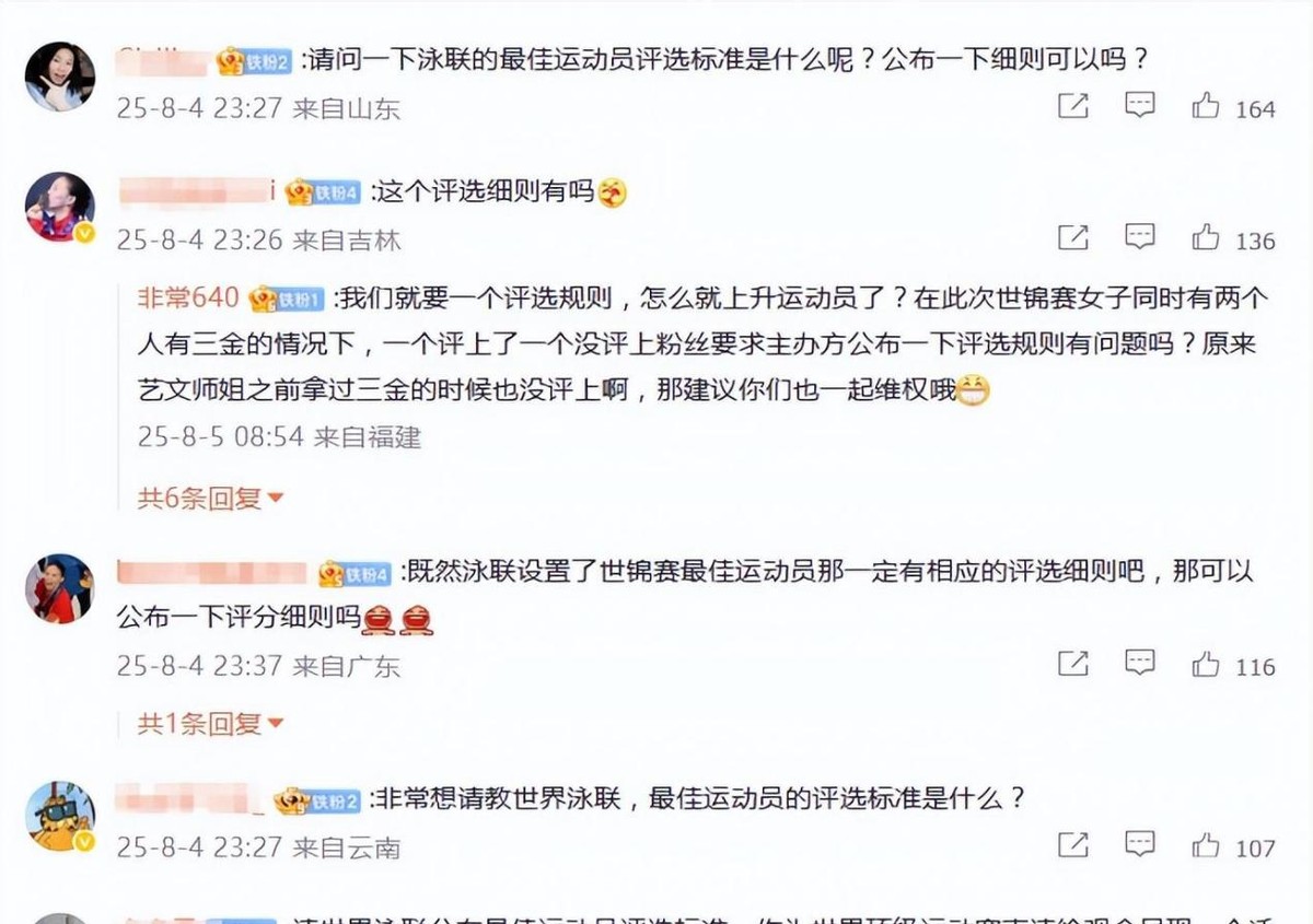 这奖一发出来,网上好多支持陈芋汐的人就有点坐不住了,心里头直犯嘀咕。大家也不是说陈艺文不配拿,人家也是世界冠军,就是想不通这评选到底是按啥标准来的。俩人都是三块金牌,功劳簿上都写得满满的,为啥最后是她不是她?很多人都希望官方能出来把规矩讲讲清楚。
