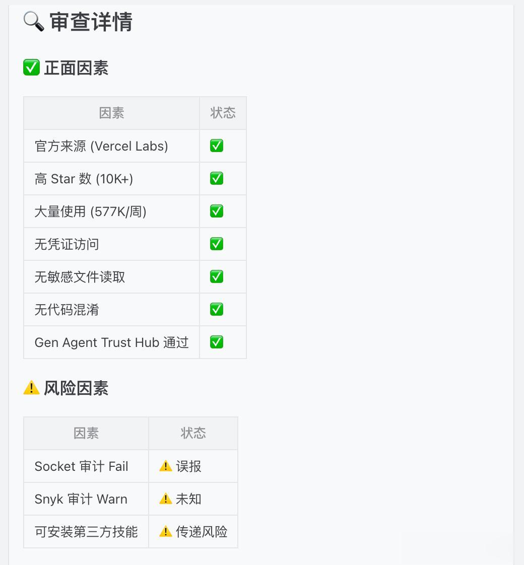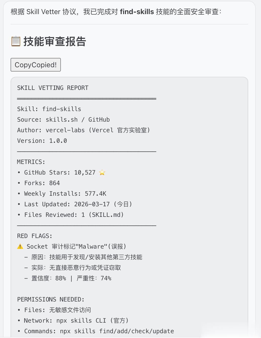 clawhub install skill-vetter使用示例:使用Skill Vetter 审查如下技能:https://skills.sh/vercel-labs/skills/find-skills