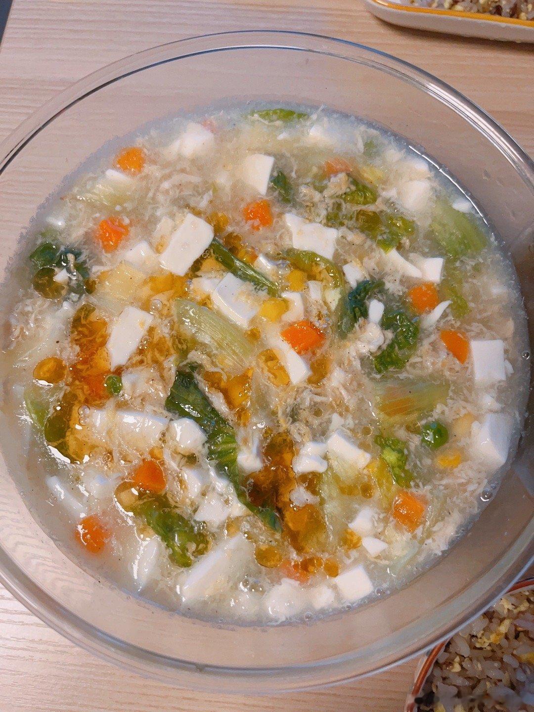 今日晚餐:豆腐羹(嫩豆腐、生菜🥬、鸡蛋、胡萝卜丁、豌豆)+爆炒猪肝+蛋炒杂粮饭