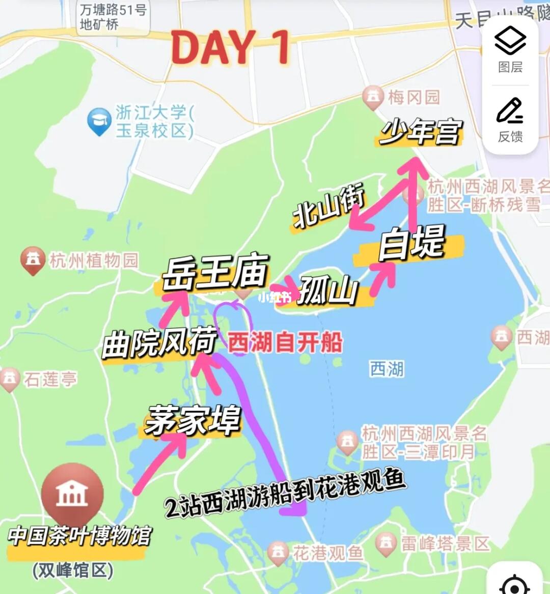 茶叶博物馆双峰馆-茅家埠-曲院风荷-岳王庙-孤山-平湖秋月-北山街