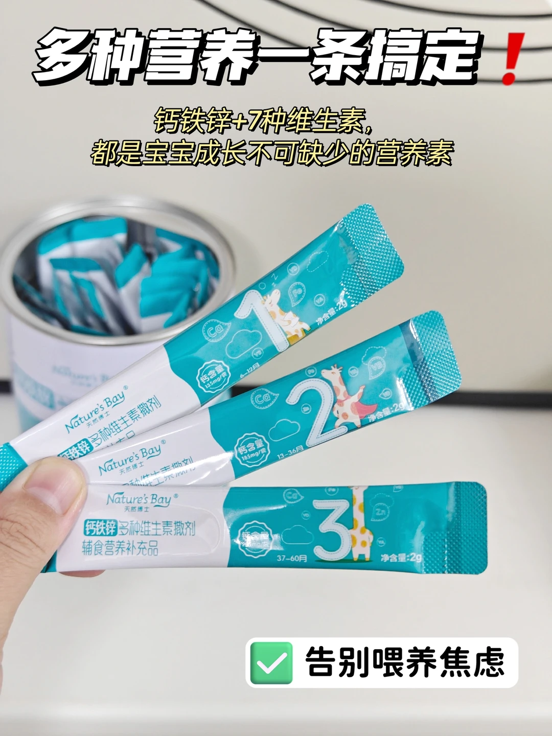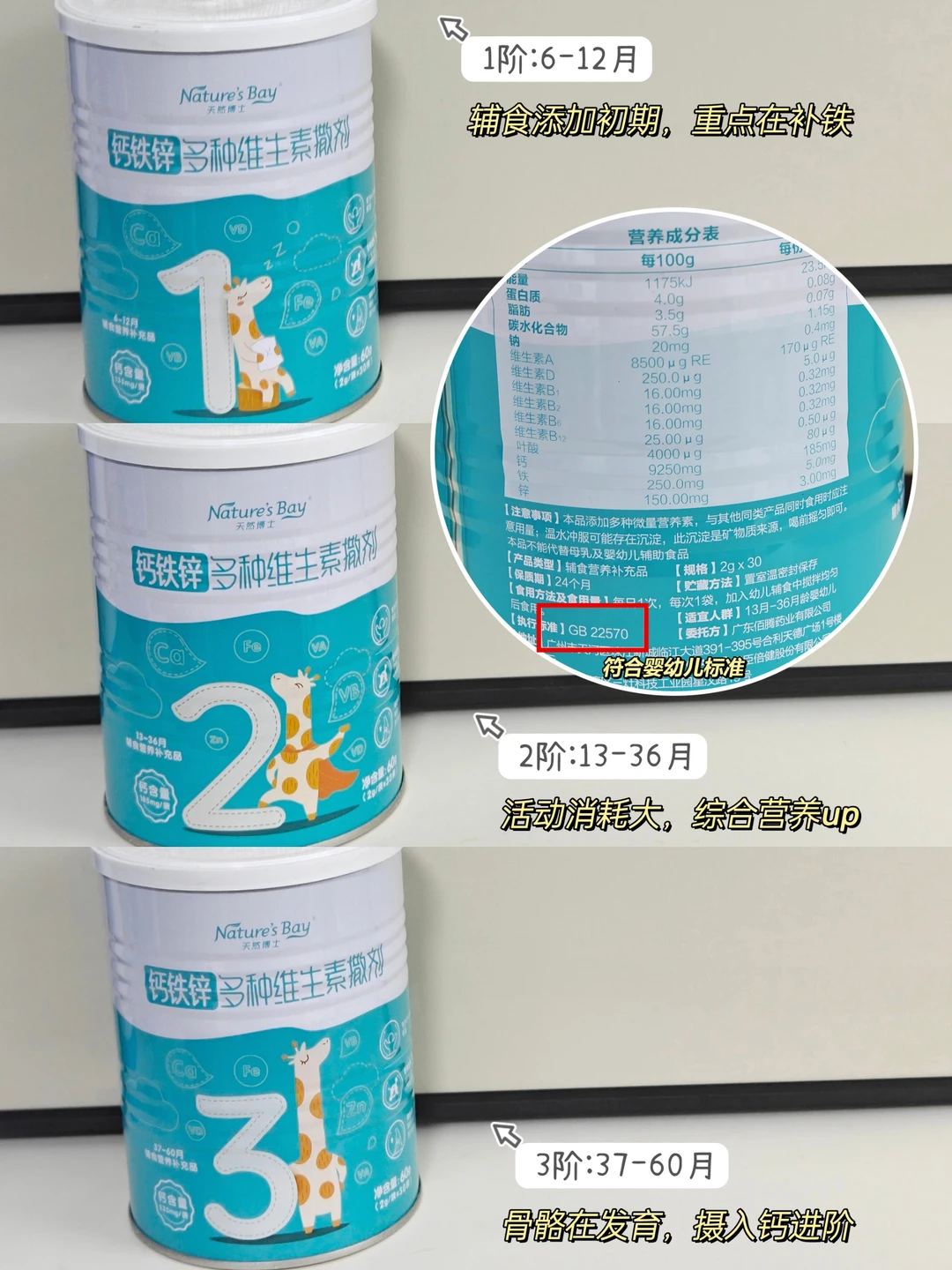 我认真看了后面的成分表,每一条都是钙、铁、锌和7种维生素搭配,很好解决了宝宝营养不均衡的问题。