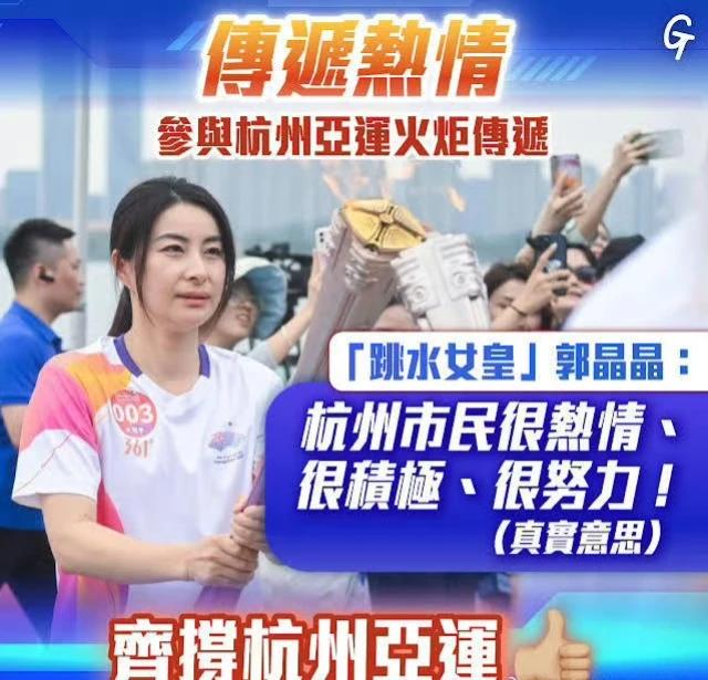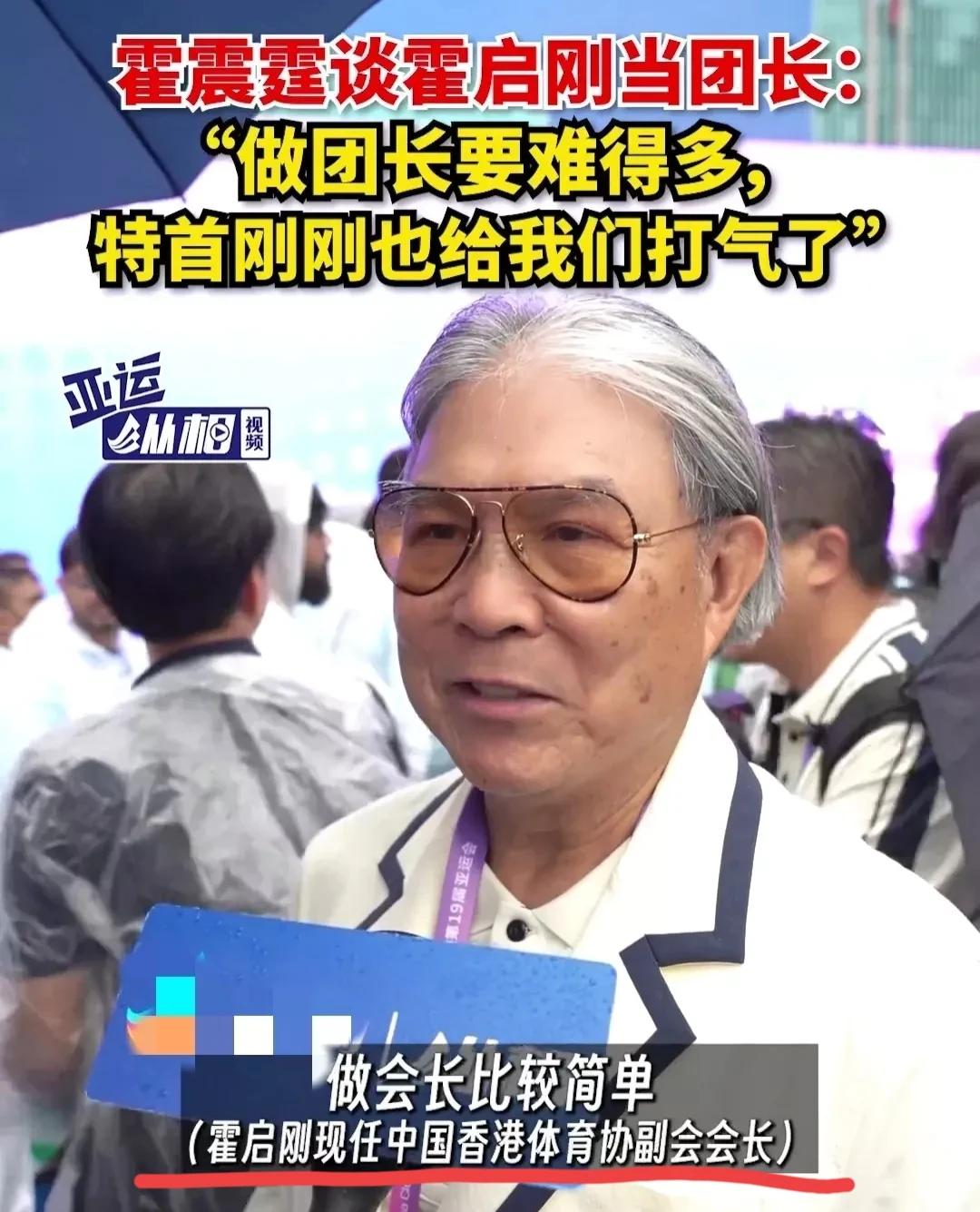 霍家一家三口齐聚杭州。 霍震霆,中国香港体育协会暨奥林匹克委员会会长。 霍启刚,中国香港代表团团长。 郭晶晶,参与杭州亚运火炬传递。