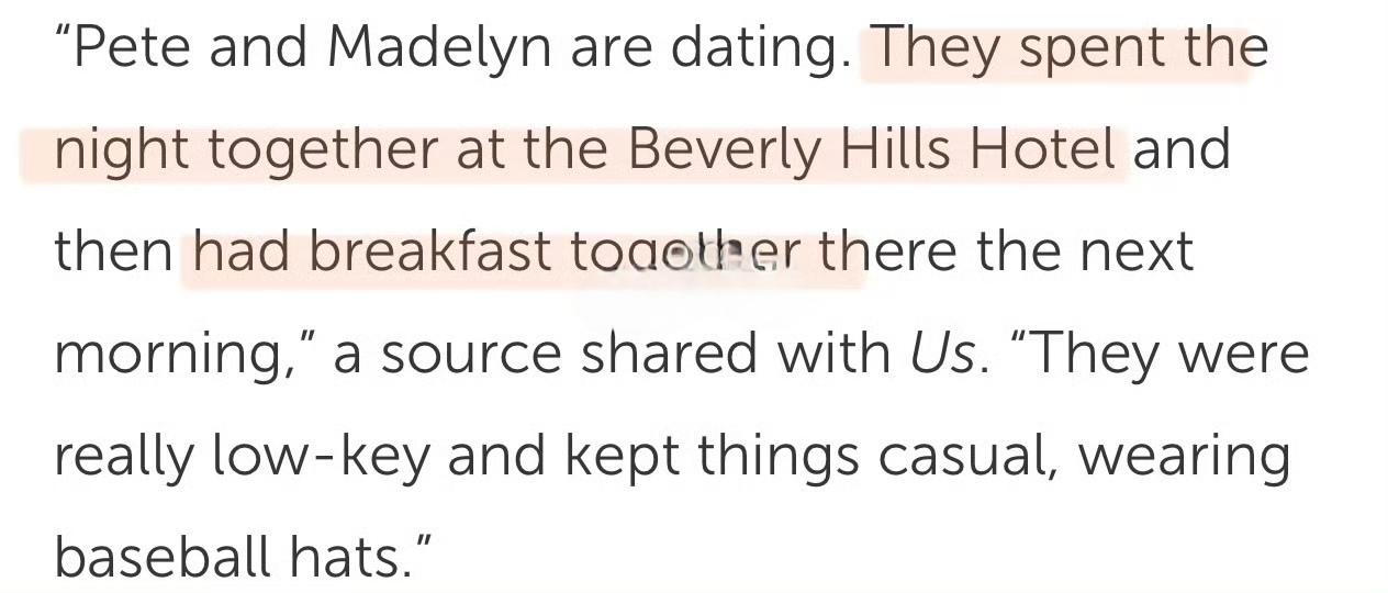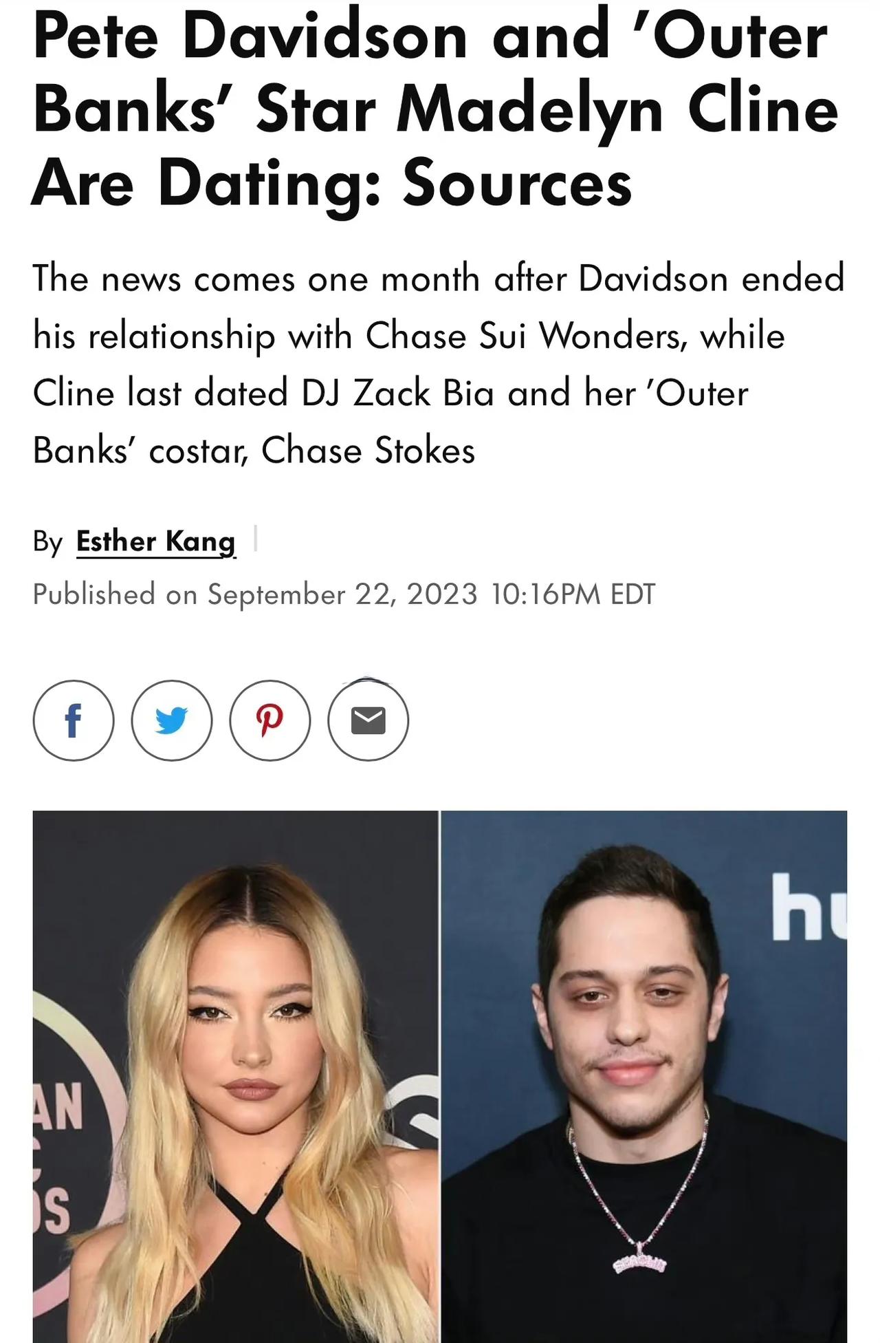 #娱评大赏#皮特分手一个月后又交新欢! 皮特Pete Davidson一个月前和女演员Chase Sui Wonders分开后,被拍到与新的交往对象Madelyn Cline约会! 两人被目击者爆料在比佛利山庄酒店过夜,停留到第二天一起享用早餐! 不得不说,又一位美女沦陷!不知道皮特的这个女友能维持多久?#娱圈每日速递# #娱乐 #八卦# #娱乐爱吃瓜#