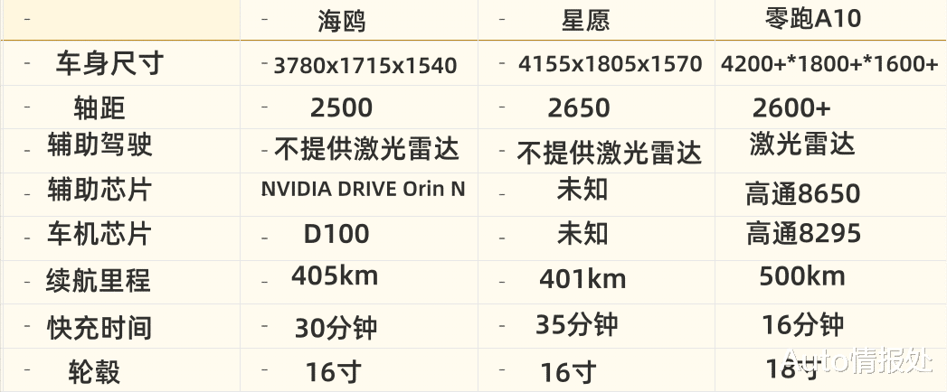 说到产品力方面,不得不提同级别热度比较高的海鸥和星愿,海鸥的辅助驾驶只提供高速路段,星愿只提供L1级别的辅助驾驶功能,车机方面,A10采用旗舰级8295芯片,强大的芯片算力,也能让车机实现更多功能,系统更加流畅,反观海鸥和星愿并没有采用这样高规格的芯片,辅助驾驶功能也有一些差异化,关键数据对比请参考以上表格,其它方面,还有待A10正式上市公布。