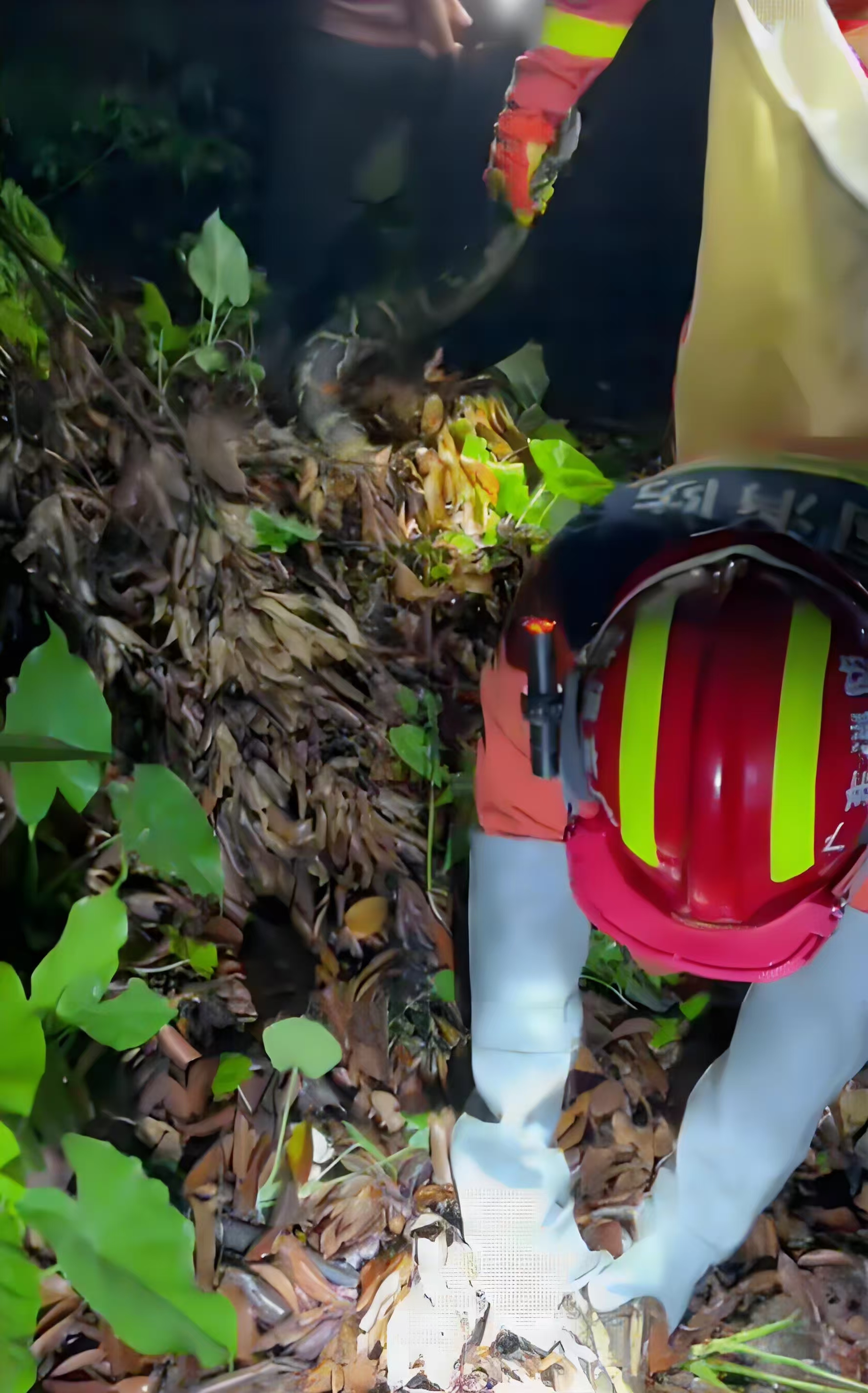 当三方救援人员抵达现场时,发现这条蟒蛇正盘踞在地上休息。经判断,这个“大家伙”可能刚吞食了附近养殖的鸡鸭。消防队员谨慎靠近,迅速控制了局面,将这条长约3.5-4米、重56斤的巨蟒安全捕获。