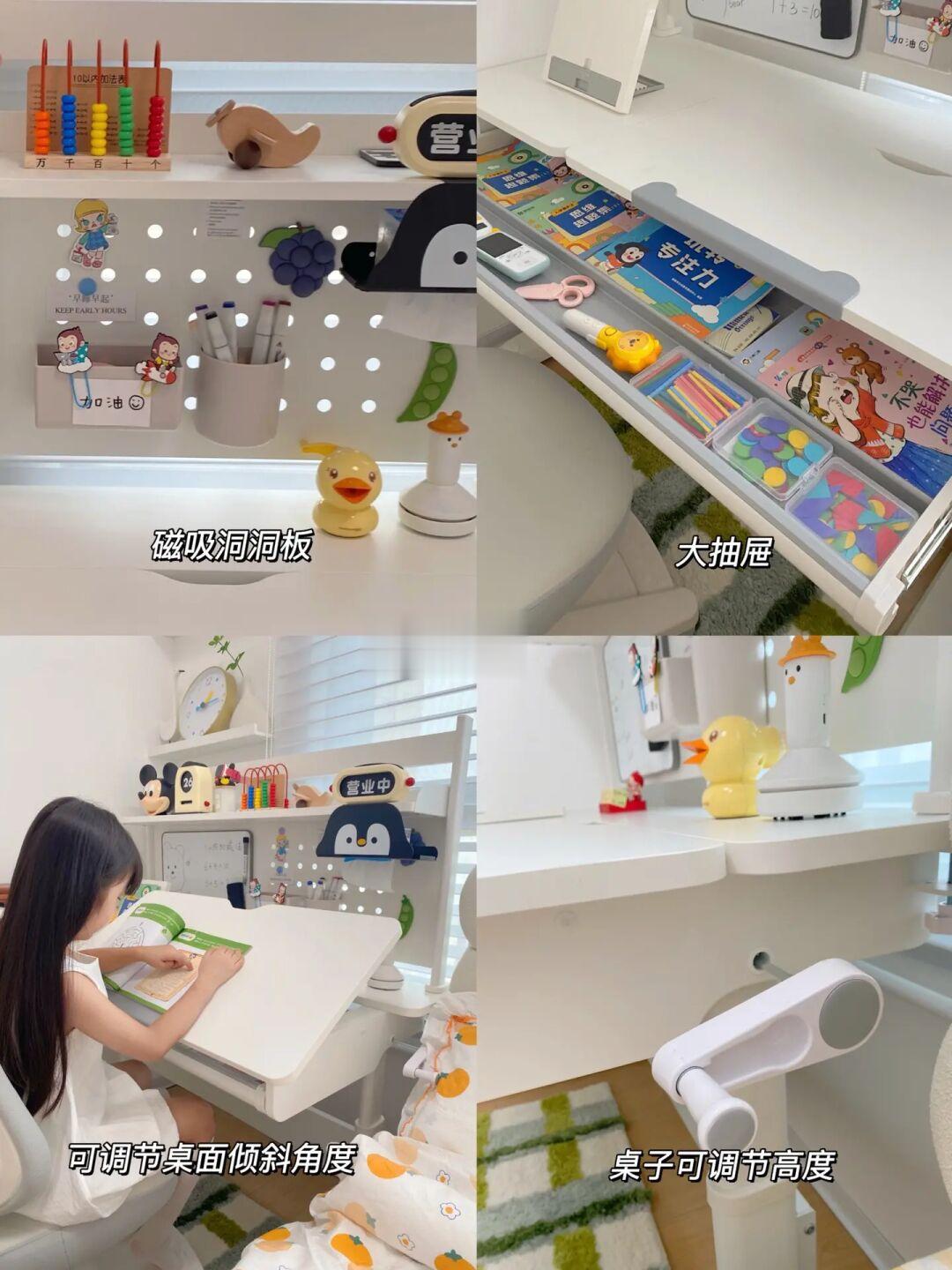 它功能很齐全,自带书架洞洞板,可磁吸小白板,家里有投影仪的还可以解锁新玩法在小白板上投屏。下面的大抽屉,放画册、文具,上层的书架用不到还可以拆卸下来变成一张大平桌。
