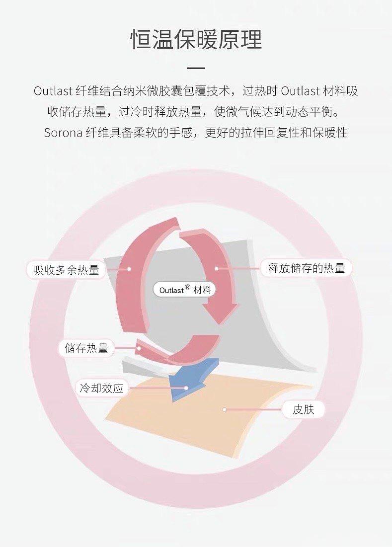 里层填充是NASA宇航的outlast调温纤维 ,轻盈保暖。整个透气性也很好!又轻又暖也不用担心闷热返汗着凉。