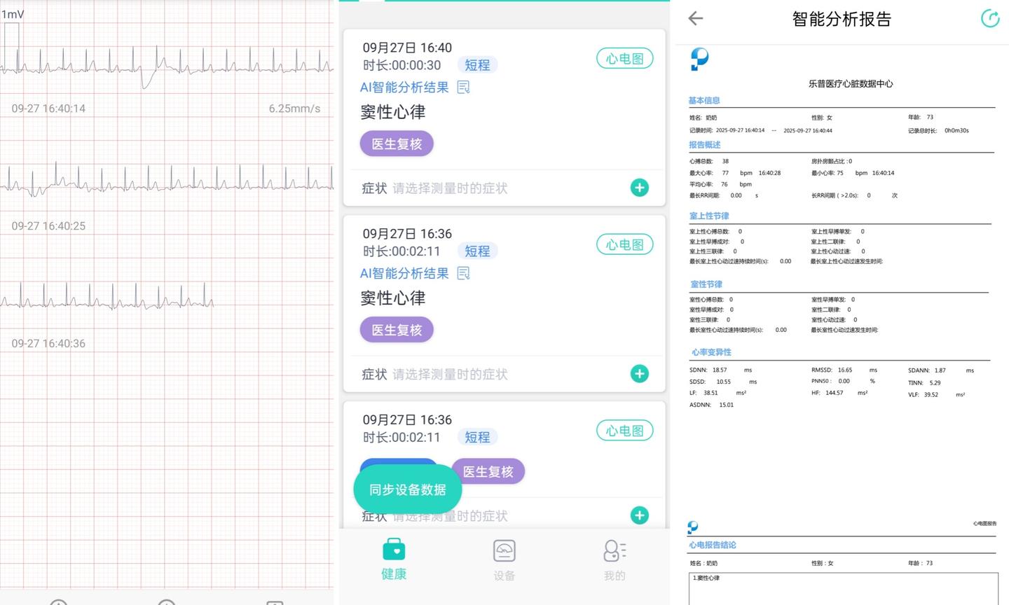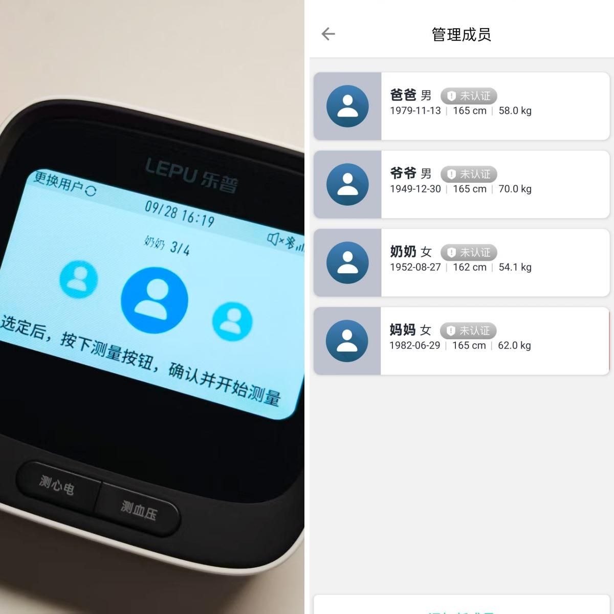 心电波形、多项筛查,一应俱全,而且可以建立多个用户,存在不同名下,爷爷、奶奶、爸爸、妈妈,清清楚楚,对应到App里也方便查询。