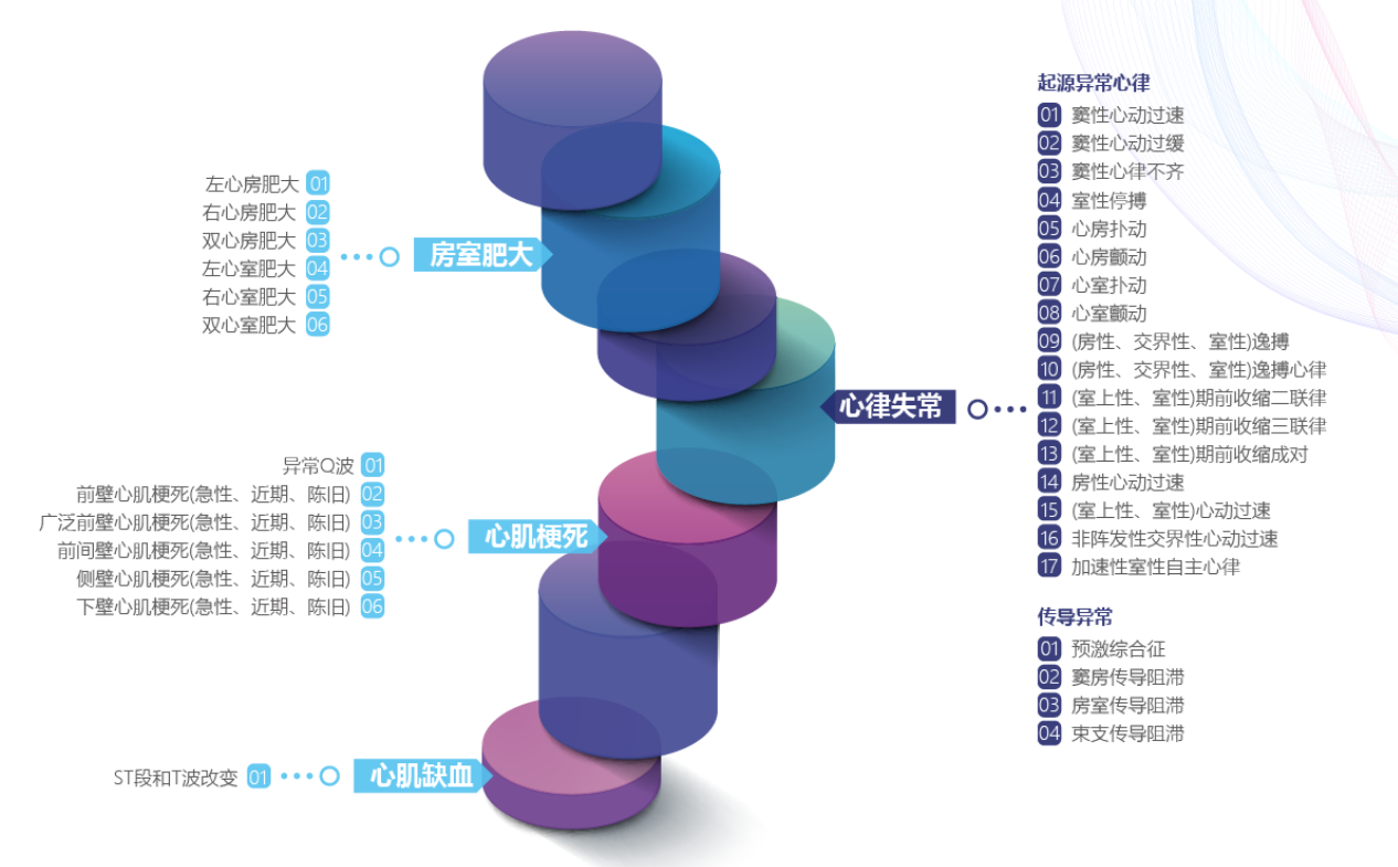 支持16种心搏类型分类,104种以上特殊心电诊断类型分类,分类更合理,判断更细更准,来源于30万病人近3千万精确标注的数据片段,使用100万独立的测试数据进行测试,准确率可高达95.2%。