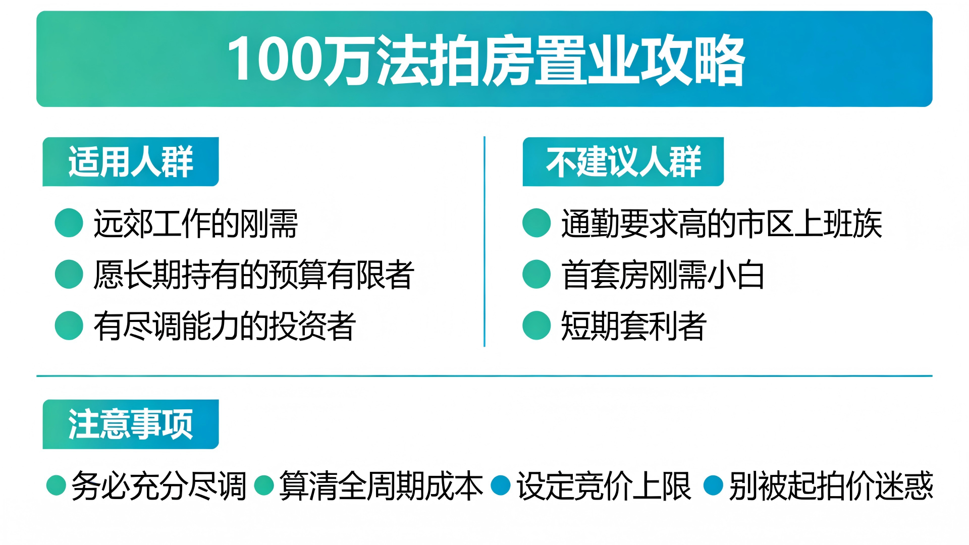 100万法拍房适合在远郊工作的刚需、愿长期持有的预算有限者或有尽调能力的投资者;通勤要求高的市区上班族、首套房刚需小白、短期套利者不建议入手。