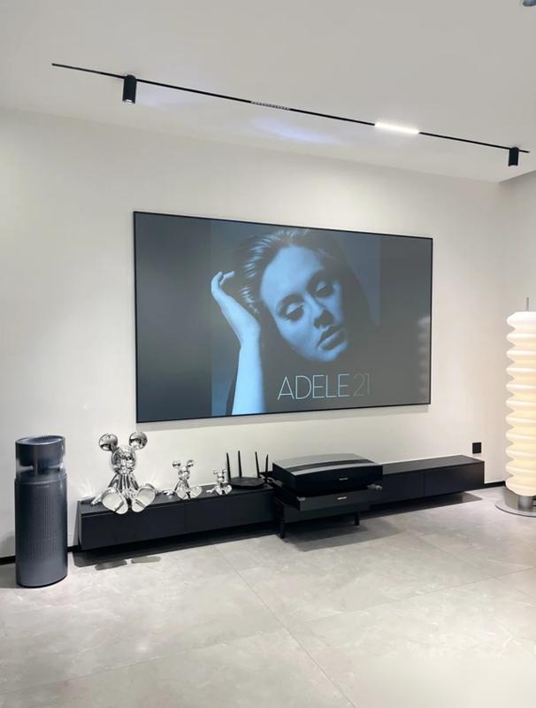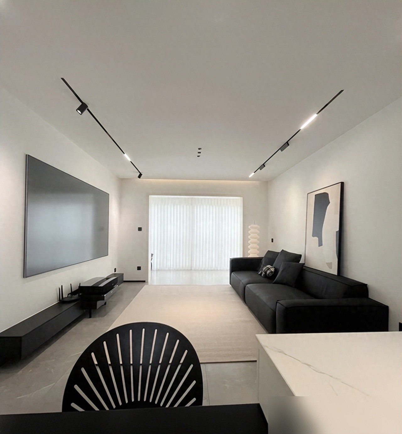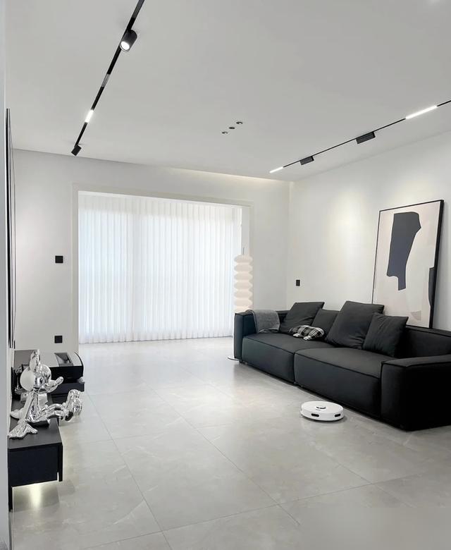 大白墙搭配无主灯设计,天花板干净利落,光线均匀洒落,整个屋子瞬间显大不少。