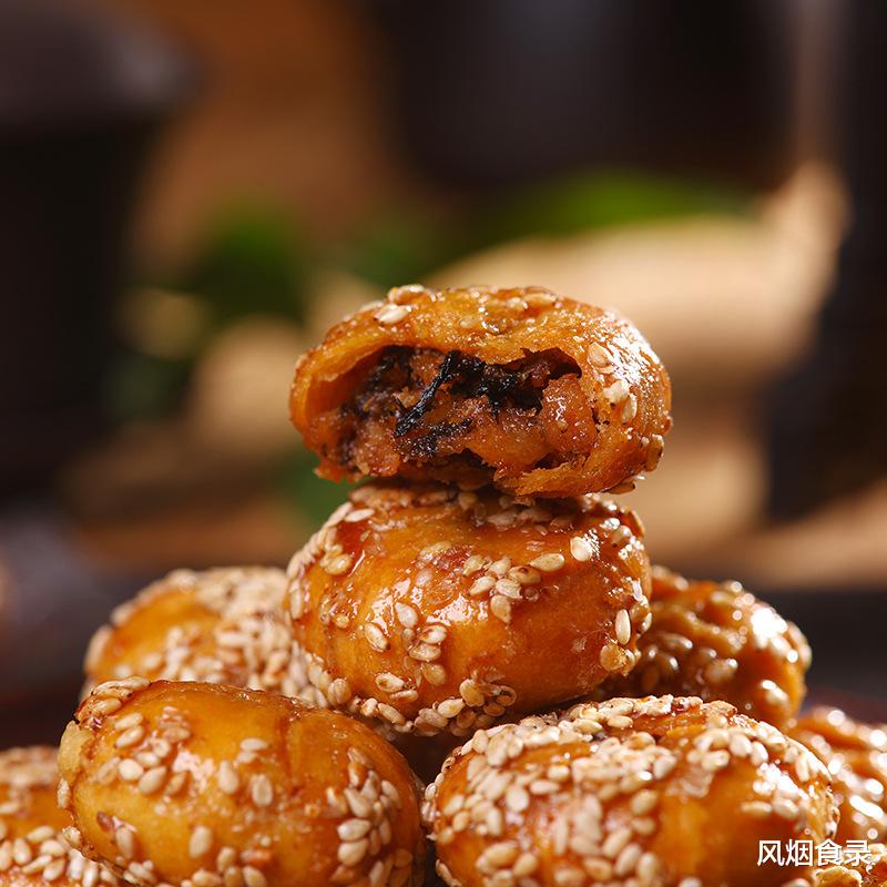 这酥饼外皮酥脆得“掉渣”,内里裹着红糖、芝麻与梅干菜肉馅,咬一口“咔嚓”作响,甜而不腻,咸香交织。