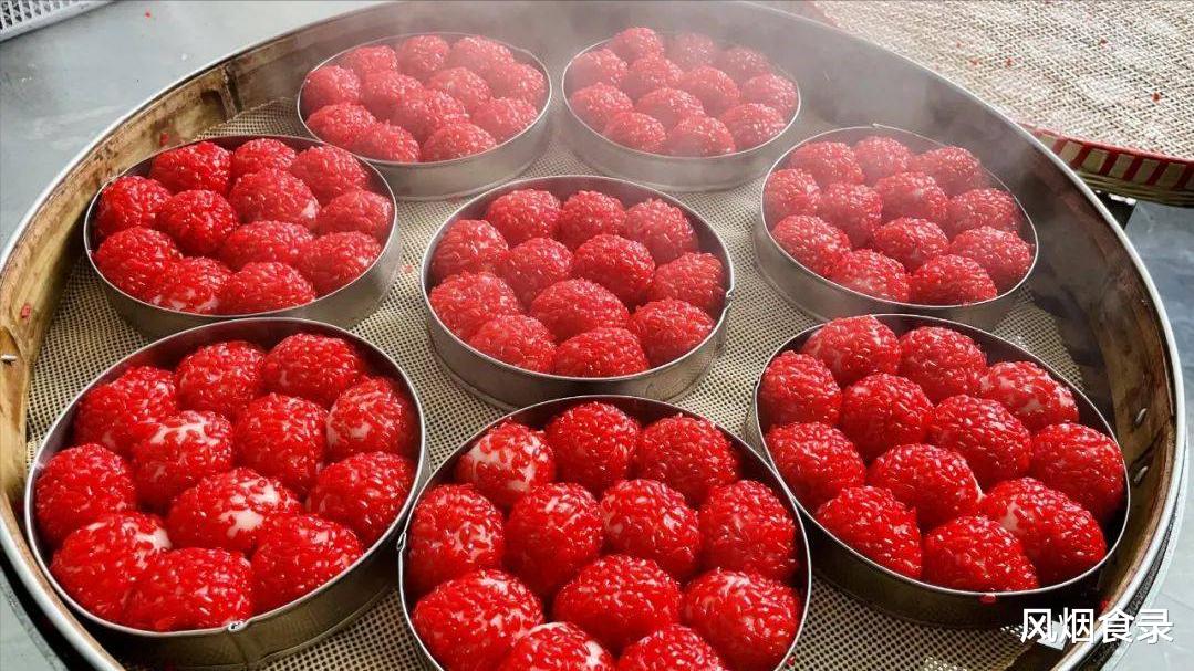 红曲米熬汁浸糯米成“红衣”,黑芝麻、义乌红糖、板油拌馅,搓圆裹红米后蒸20分钟,