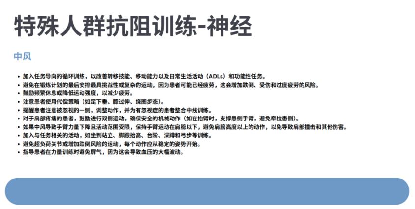 卒中后患者往往会遗留不同程度的肢体功能障碍、语言障碍、认知障碍等,体育锻炼和康复训练是促进患者功能恢复的重要手段。《“健康中国2030”规划纲要》中也提到:加强体医融合和非医疗健康干预。发布体育健身活动指南,建立完善针对不同人群、不同环境、不同身体状况的运动处方库,推动形成体医结合的疾病管理与健康服务模式,发挥全民科学健身在健康促进、慢性病预防和康复等方面的积极作用。《运动处方中国专家共识(2023)》指出,运动康复可通过抗阻训练、平衡训练等帮助卒中患者改善肢体功能,提高生活质量。