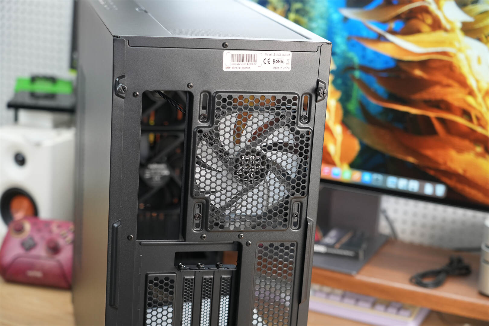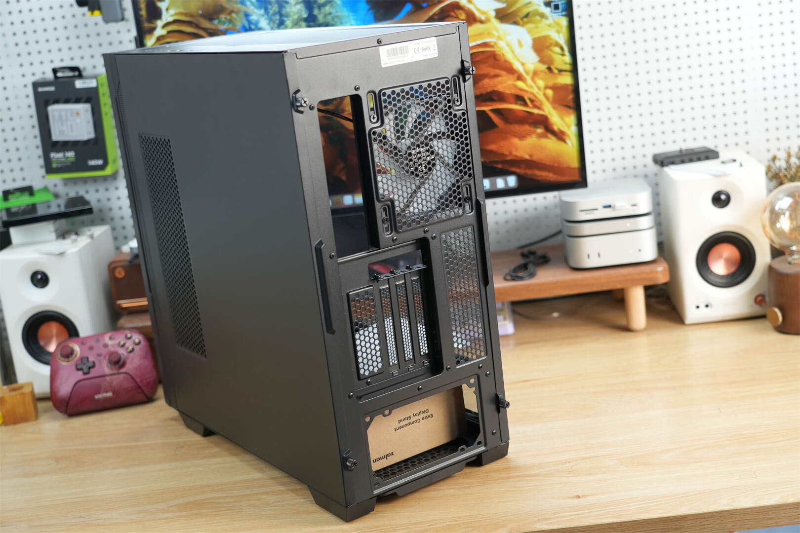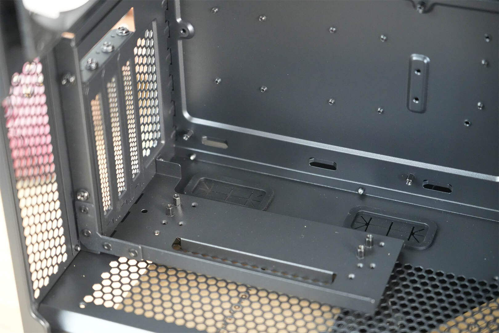 从机箱尾部观察可见,其显卡安装位采用竖装设计,标配预装好的竖装支架模块,下方三组可拆卸PCI挡板间距经过优化,能够完美兼容市面主流大型三风扇显卡的安装需求。