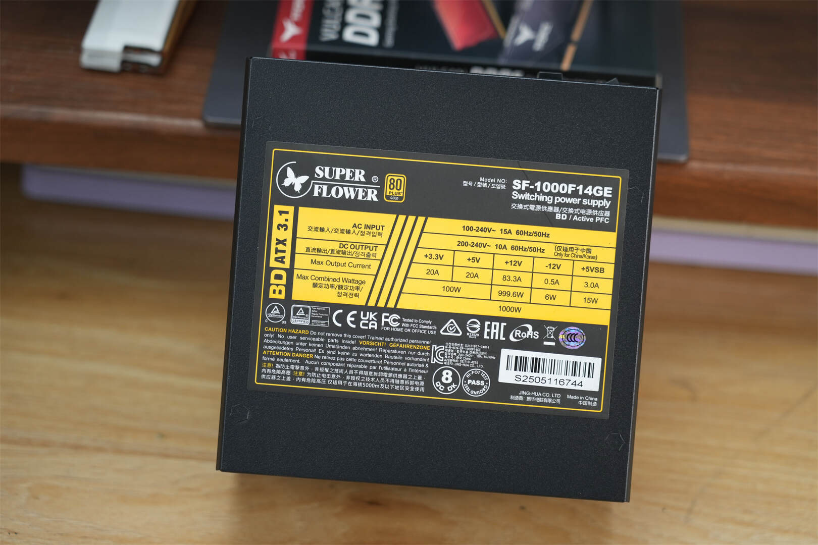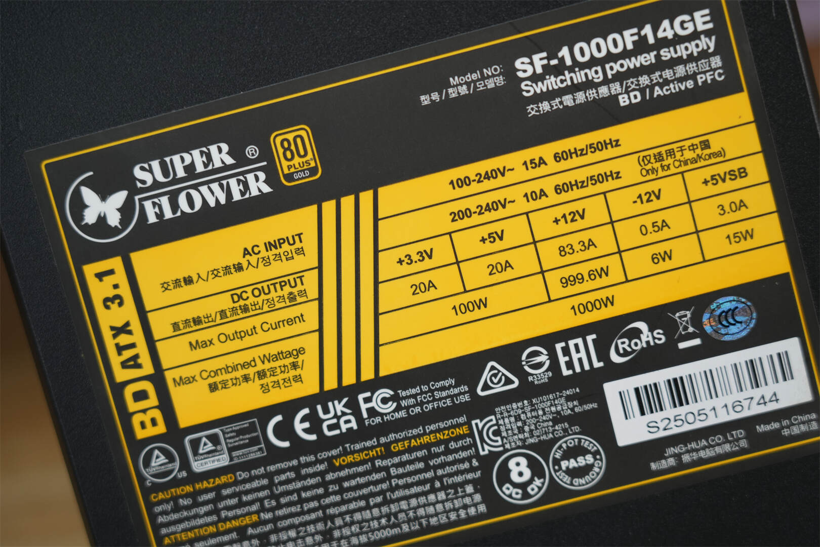 背面贴纸是电源规格说明,其中+12V额定输出电流为83.3A,最大输出功率999.6W,可轻松搞定9950X3D+RTX5090火力全开输出;而+5V与+3.3V均为20A额定输出电流,联合输出功率为100W,应对主板、内存、USB、ARGB灯等非核心部位供电绰绰有余。